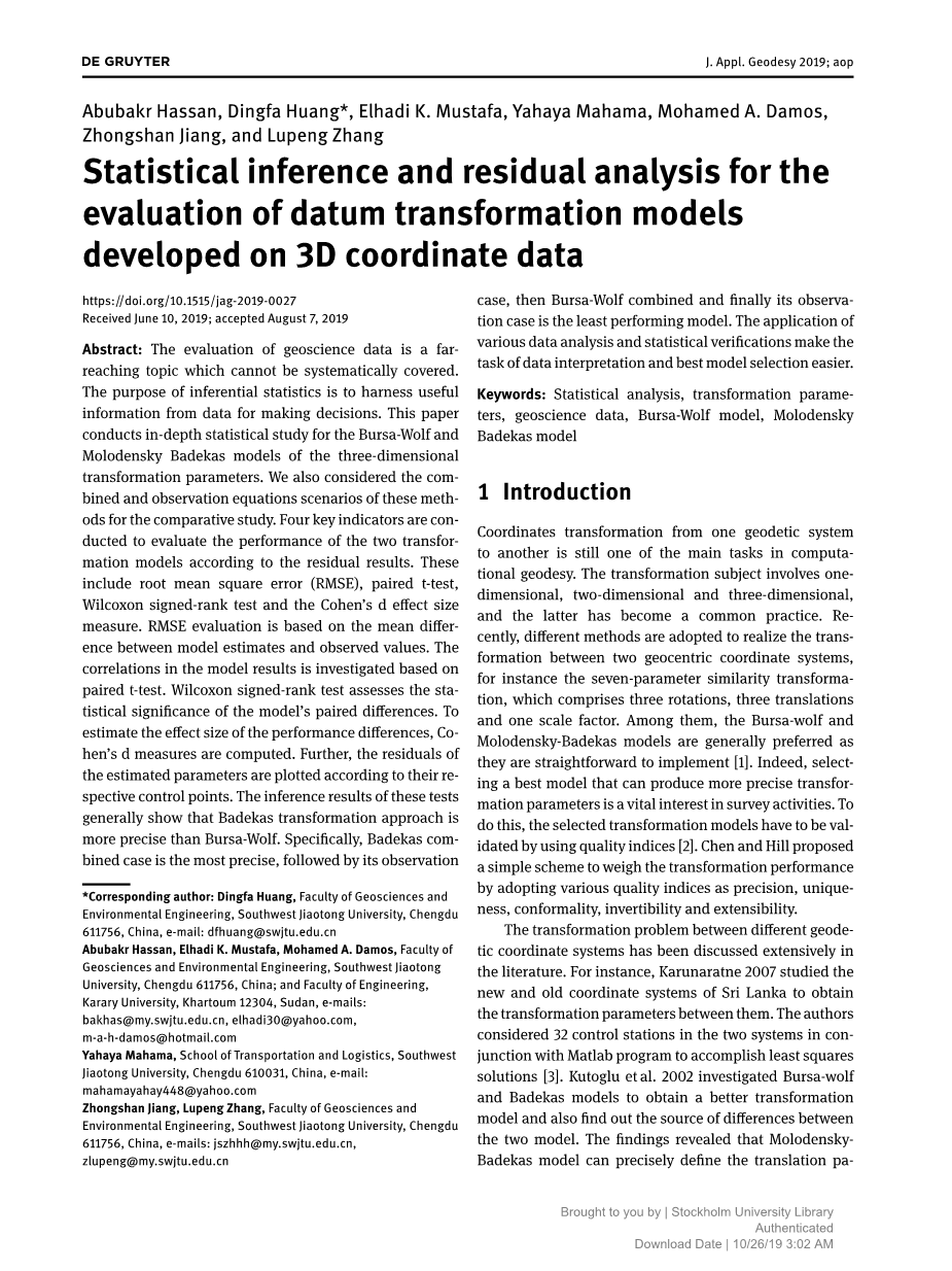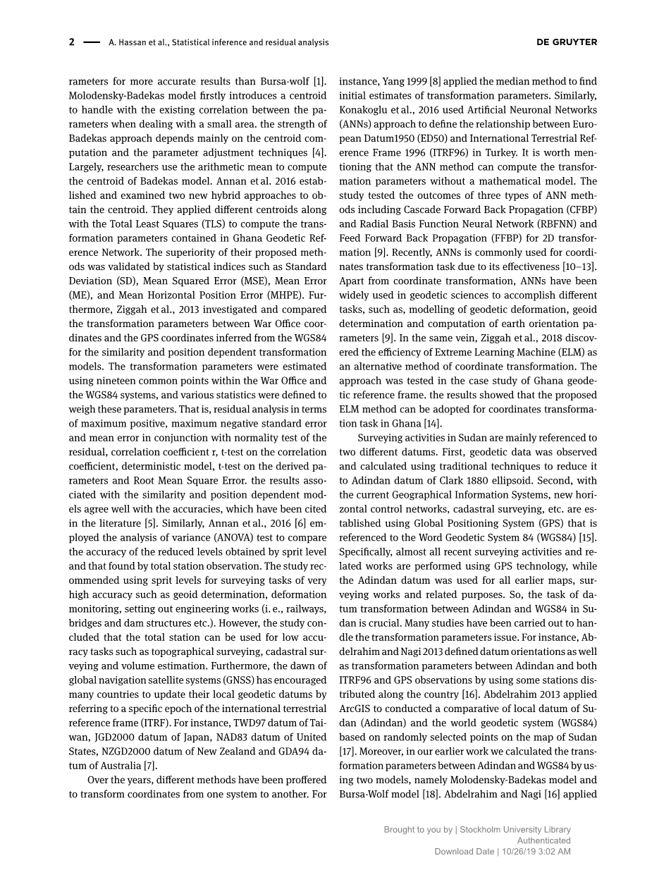 如上所述,苏丹进行了一些计算坐标转换参数的研究,但是,仍然没有一组唯一的参数可以将坐标从WGS84基准转换为局部基准。但是,导出的转换参数的可靠性通常在标准偏差或方差的背景下表示,而不是使用简单的指标来评估结果[16]。因此,在转换参数中使用不同的方法可能会导致重大错误。即使在转换过程中使用了最精确的本地网络和精确的GPS数据,受调查研究区域的平移,旋转和比例参数的模型效果也可能导致重要的错误,这些错误将影响即将到来的应用程序。