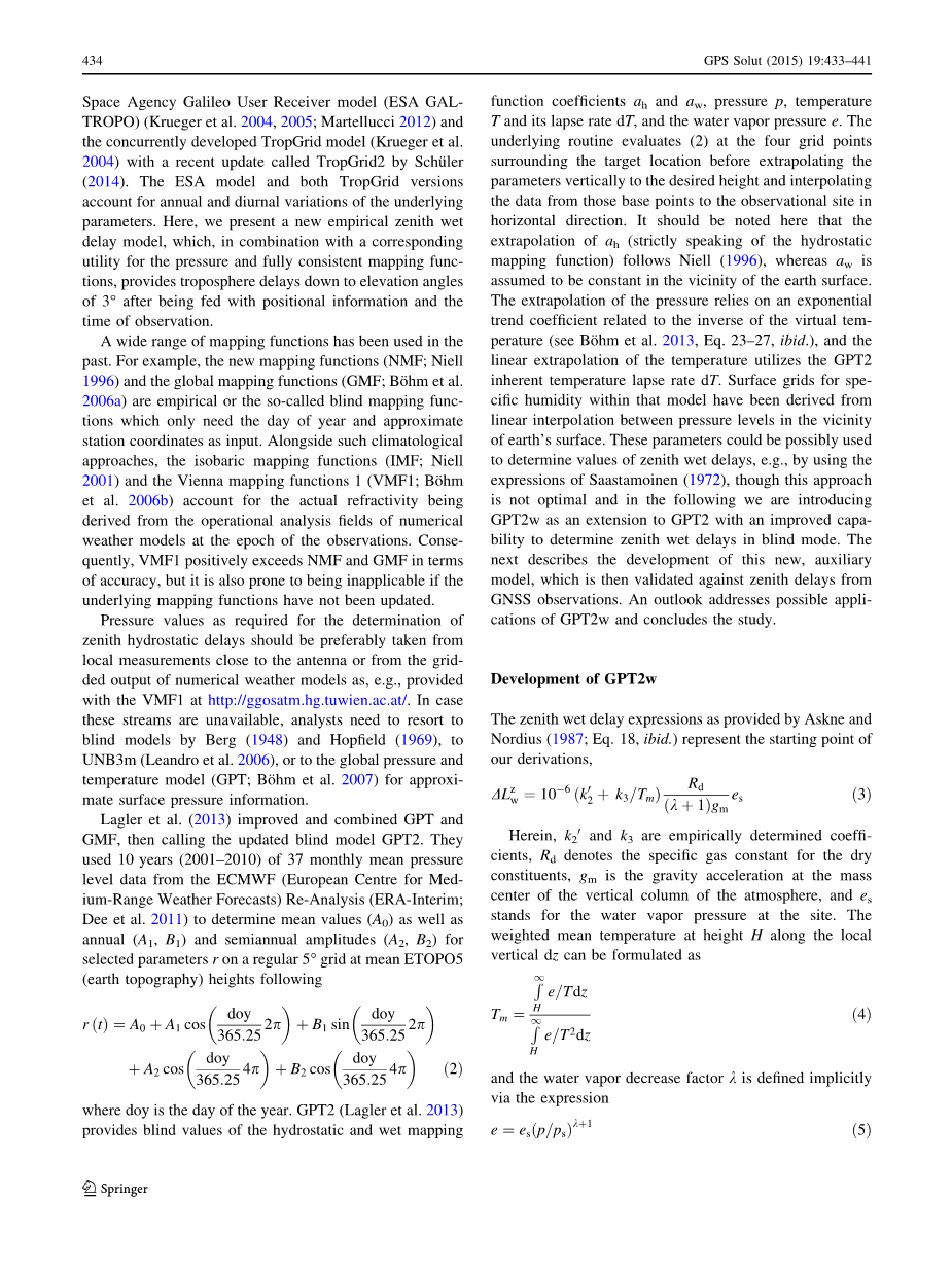 但是,一些实时应用程序比如定位和导航工作,没有后续处理分析的功能。因此需要对提供准确的先验估计。目前广泛采用天顶湿延迟评估工具有RTCA-MOPS模型[21,7],欧洲航天局伽利略用户接收机模型(ESA GAL) (Krueger et al. 2004; Martellucci .2012)和同时代发展的TropGrid模型(Krueger et al. 2004)。TropGrid模型最近更新了TropGrid2(Schuler et al. 2014),ESA模型和TropGrid模型都标明了基础参数的年变化和日变化。在此,我们提出一个新的天顶湿延迟经验模型,该模型结合了实时气压和映射函数,利用位置信 息和观测时间即可提供到仰角为3°处的对流层延迟。