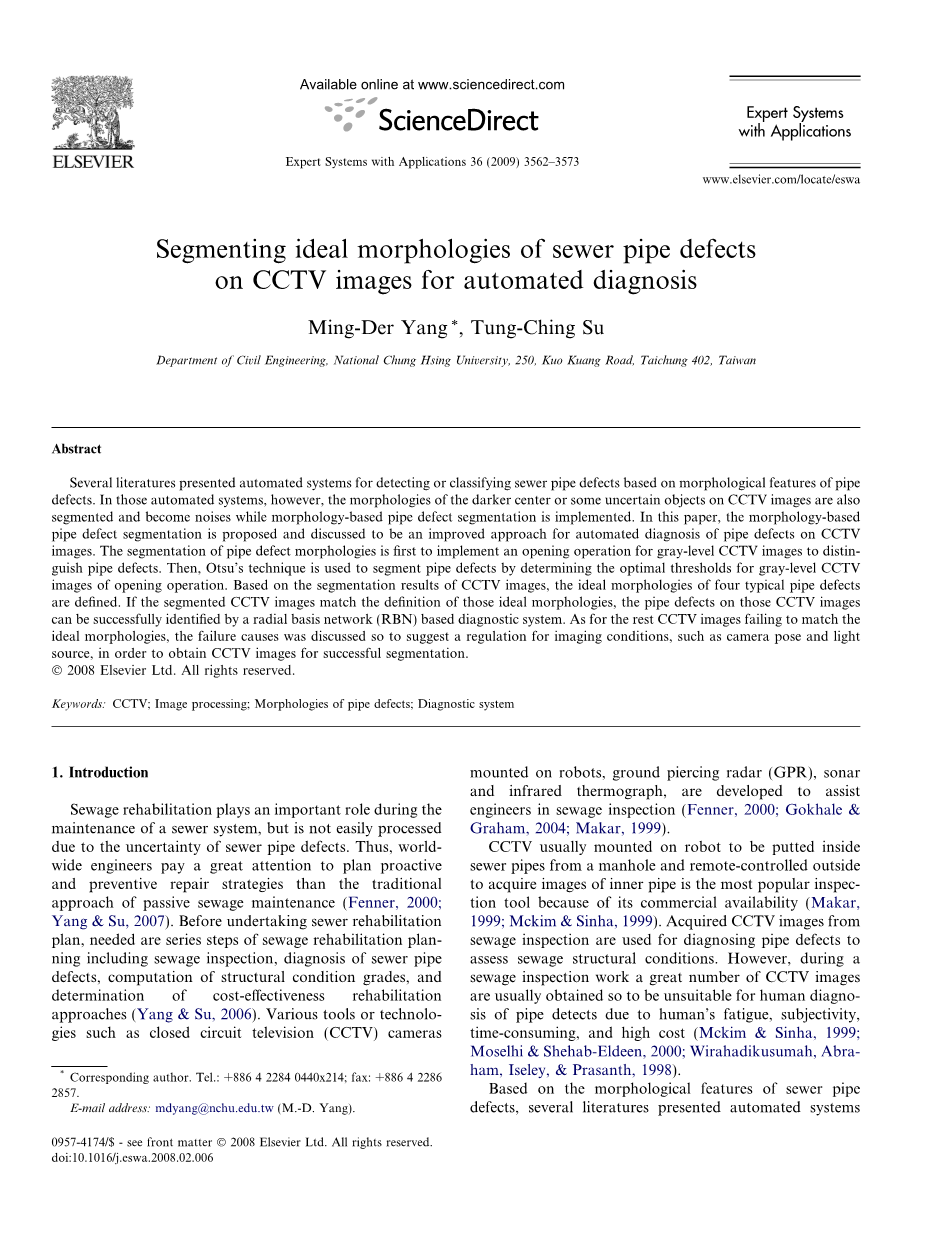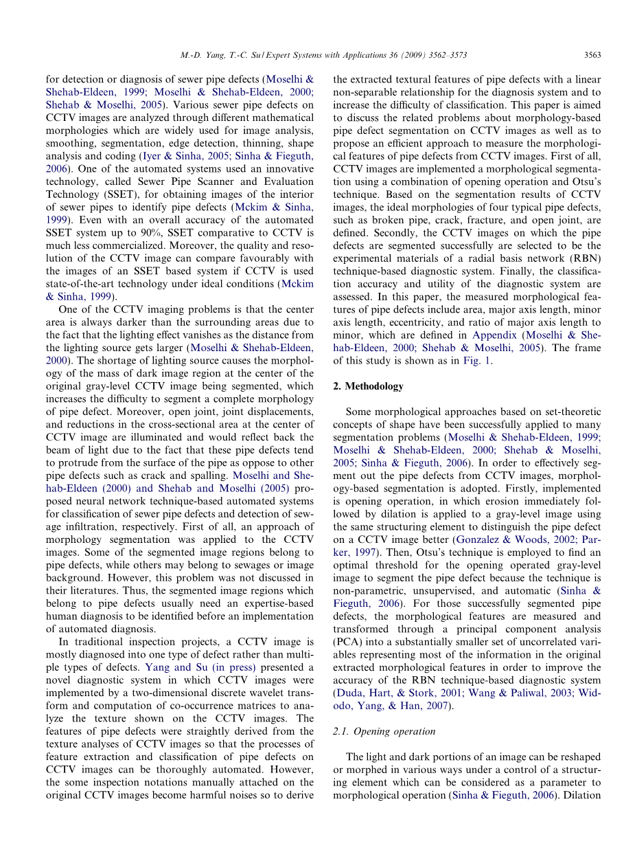 一些基于形状集理论概念的形态学方法已经成功地应用于许多分割问题(Moselhi amp; Shehab-Eldeen, 1999;Moselhi amp; Shehab-Eldeen, 2000;Shehab amp; Moselhi, 2005;Sinha amp; Fieguth, 2006)。为了有效地从闭路电视图像中分割出管道缺陷,采用了基于语素ogf的分割方法。首先,实现的是开孔操作,在开孔操作中,先对灰度图像进行腐蚀,然后进行膨胀,使用相同的结构元素对灰度图像进行腐蚀,从而更好地识别CCTV图像上的管道缺陷(Gonzalez amp; Woods, 2002;帕克,1997)。然后,由于Otsu技术是非参数的、无监督的、自动的,因此采用Otsu技术为开口操作的灰度图像寻找最优阈值来分割管道缺陷(Sinha amp; Fieguth, 2006)。对于那些成功分段管缺陷,形态学特征测量,通过主成分分析(PCA)变成远远小于组不相关的变量代表原始的大部分信息提取形态学特征以提高RBN的准确性的技术诊断系统(哈特,杜达amp;鹳,2001;Wang amp; Paliwal, 2003;杨,韩,2007)。