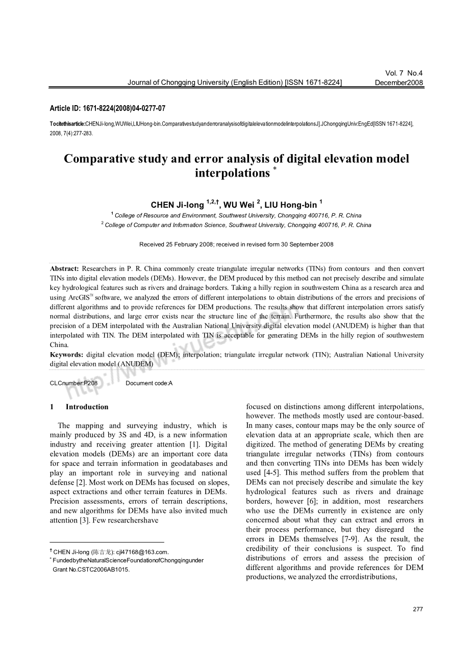 引用本文:陈继龙,吴伟,刘洪斌。数字高程模型插值的比较研究与误差分析[J]。J重庆大学:Eng Ed [ISSN 1671-8224],2008,7(4): 277-283。