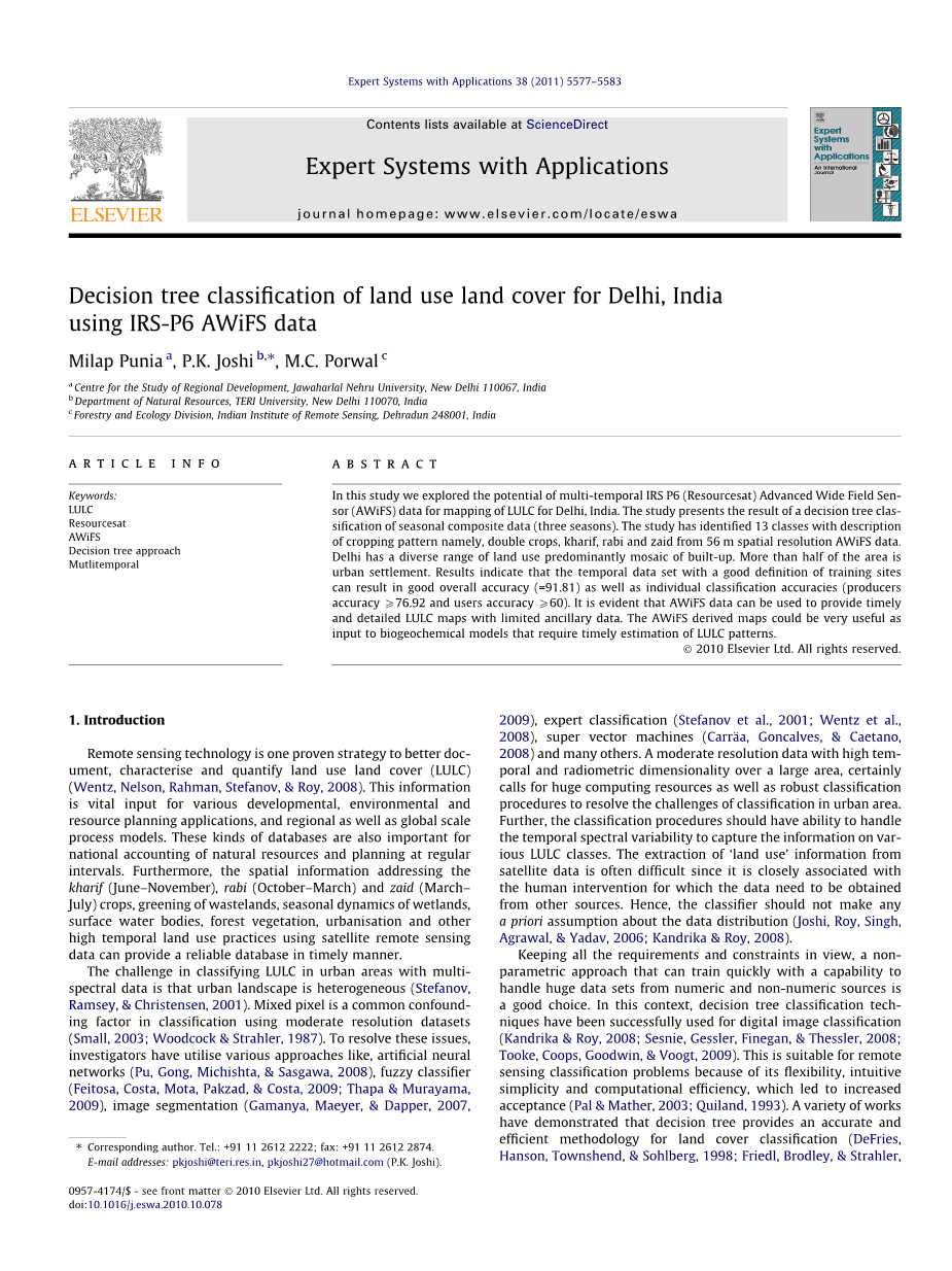 使用IRS-P6 AWiFS数据对印度德里的土地利用土地覆盖进行决策树分类