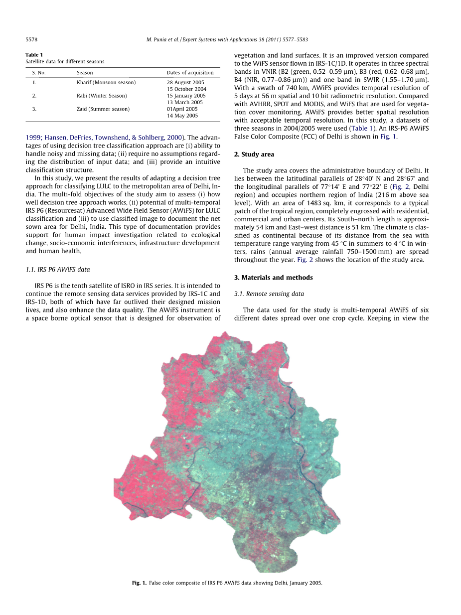 用于该研究的数据是由多时相AWiFS提供的,它研究了分布在六个不同日期的同一个作物周期中的变化情况。密切观察作物在整个地区的异质性,即使在一个季节内,也使用多日卫星数据来研究。假彩色复合材料德里的(FCC)显示在图1。表格1列出了从2004年8月到2005年5月德里州的卫星数据,包括其他LULC类别在内的种植面积。