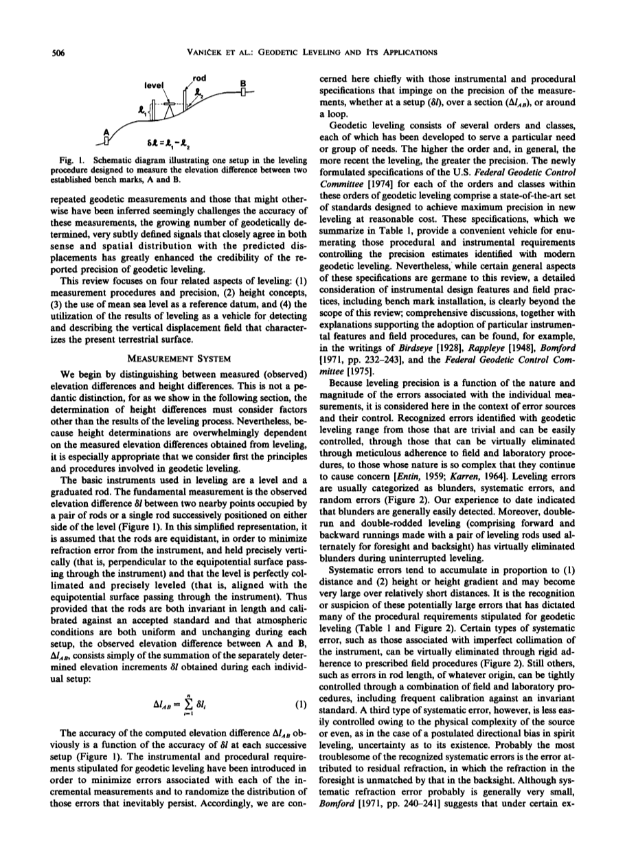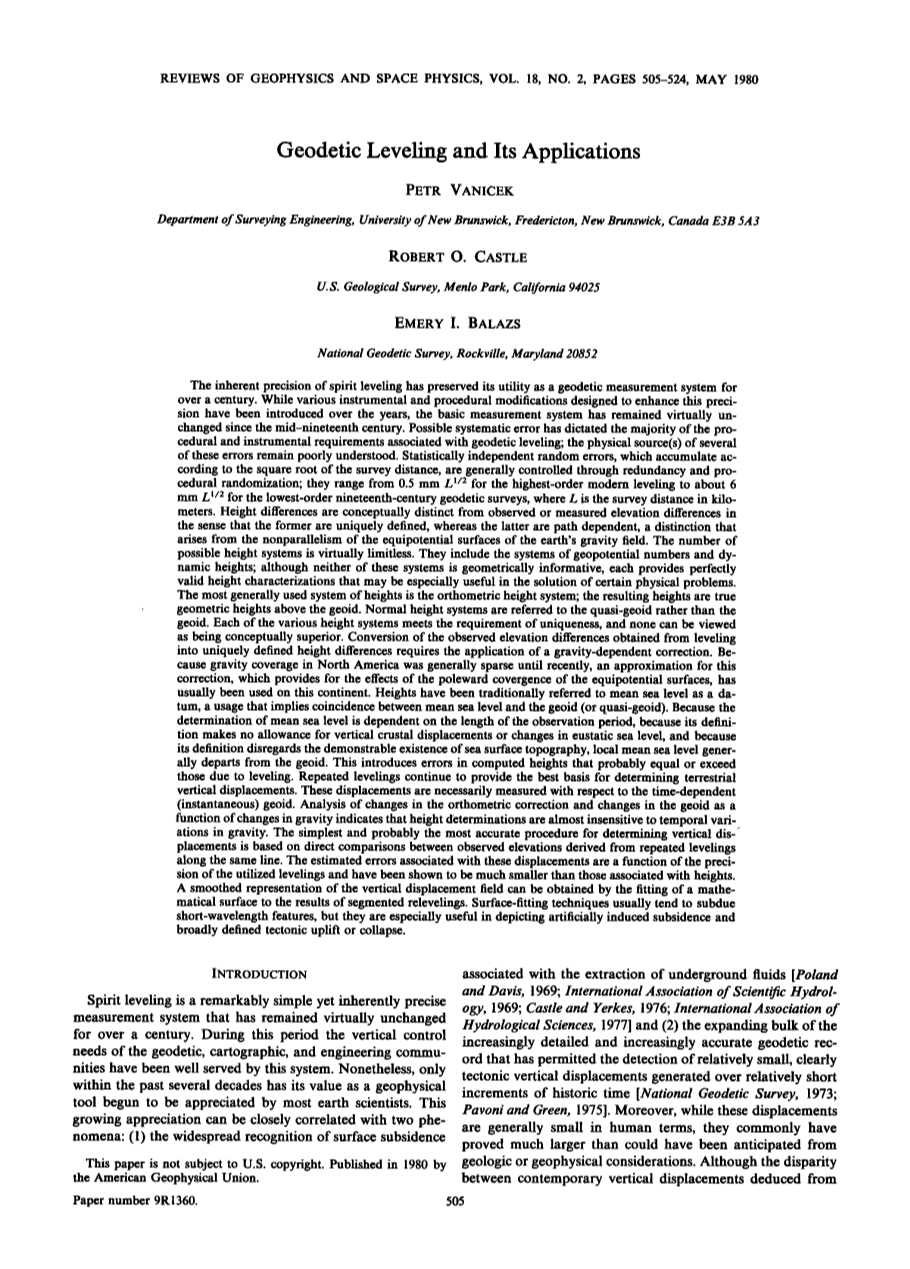 本综述主要关注水准测量的四个相关方面:(l)测量程序和精度(2)高度概念(3)使用平均海平面作为参考基准(4)利用测量结果作为载体,检测和描述表征现有地面的垂直位移场。