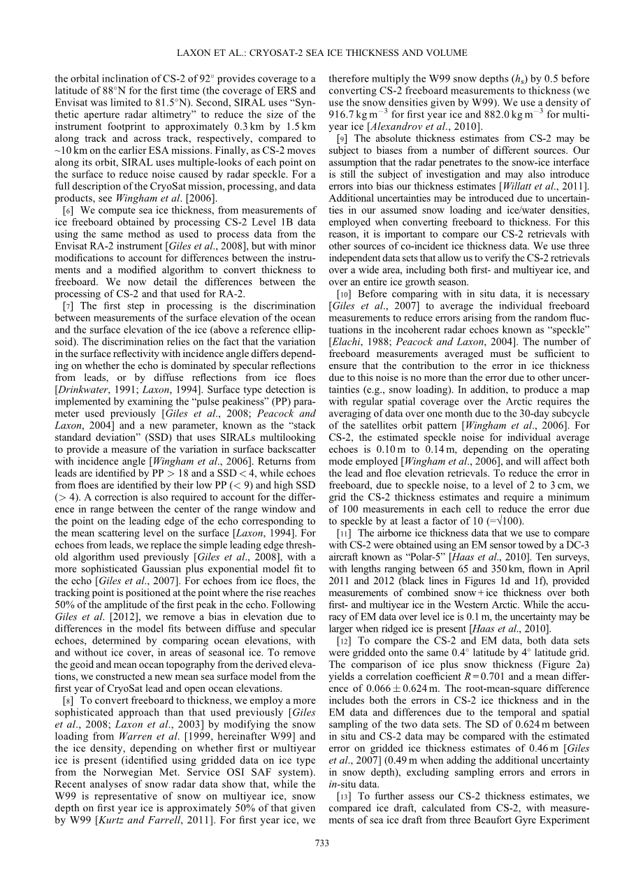 [6]我们通过处理CS-2的L1B级数据获得海冰干舷的测量数据,并用它来计算海冰厚度,使用的方法和处理Envisat RA-2仪器数据类似[Giles 等,2008],但因为仪器之间的差异和计算厚度到干舷所用的算法有了改进,所以还是有些不同之处。我们现在详细说明CS-2的处理与RA-2的处理之间的差异。