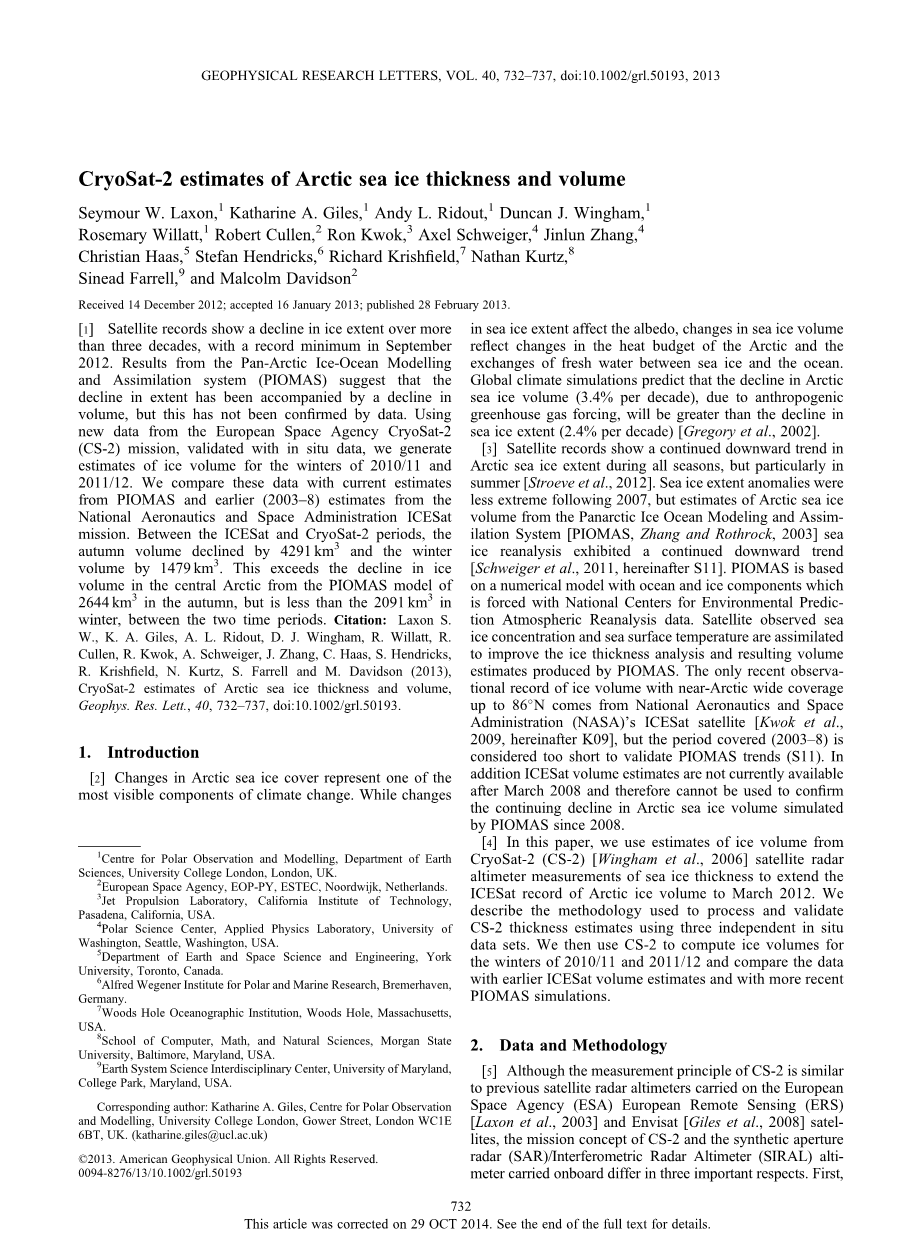 Seymour W. Laxon,1 Katharine A. Giles,1 Andy L. Ridout,1 Duncan J. Wingham,1Rosemary Willatt,1 Robert Cullen,2 Ron Kwok,3 Axel Schweiger,4 Jinlun Zhang,4 Christian Haas,5Stefan Hendricks ,6Richard Krishfield,7 Nathan Kurtz,8 Sinead Farrell,9和Malcolm Davidson2