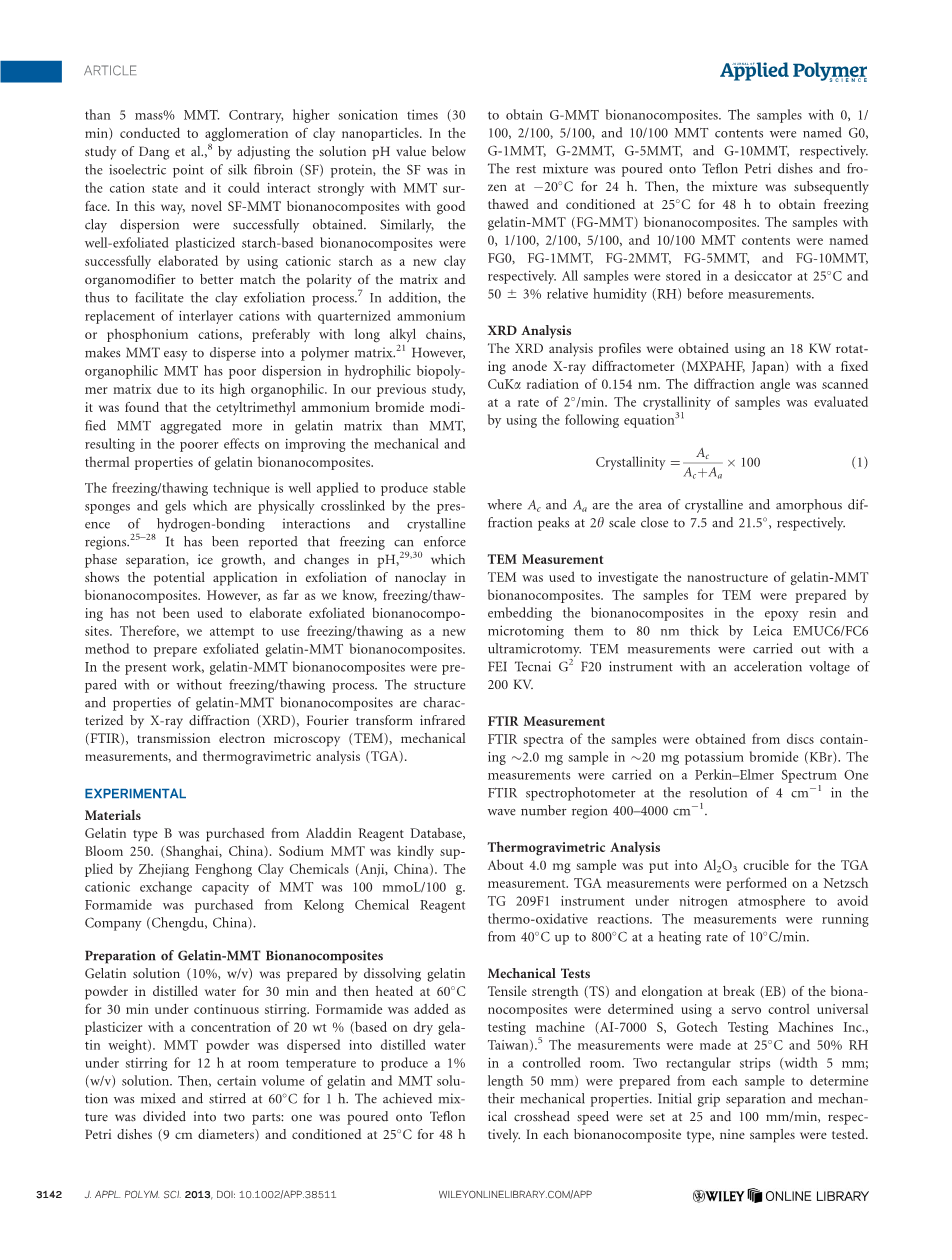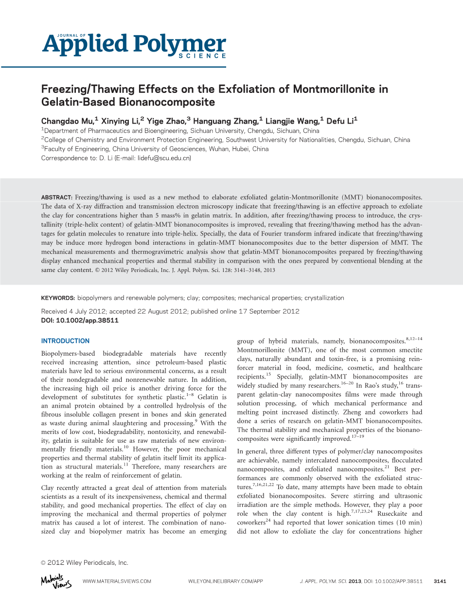 冷冻解冻循环对明胶基生物复合材料中蒙脱石剥离的影响
