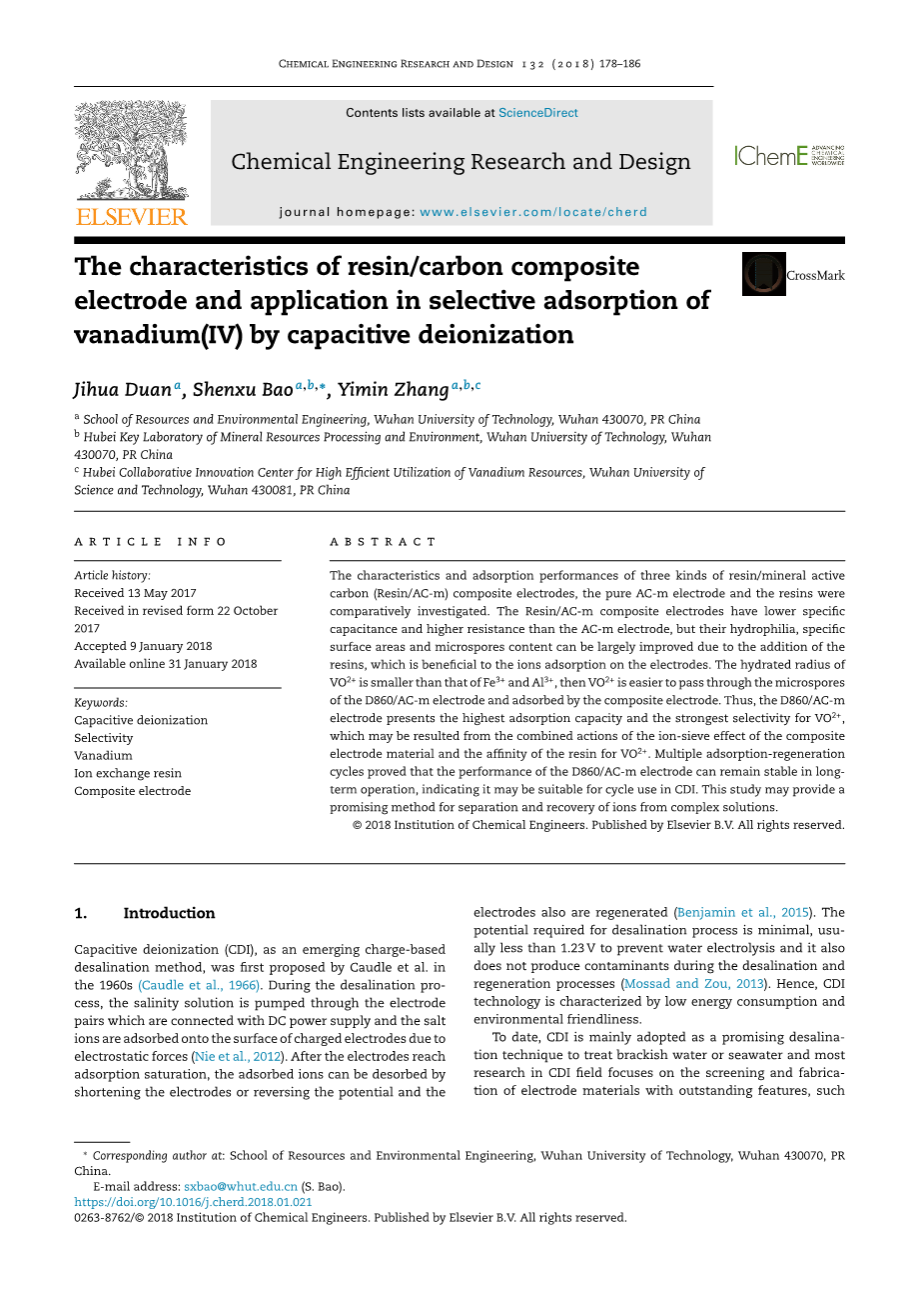 树脂/碳复合电极的特性及其在电容去离子选择性吸附钒(IV)中的应用