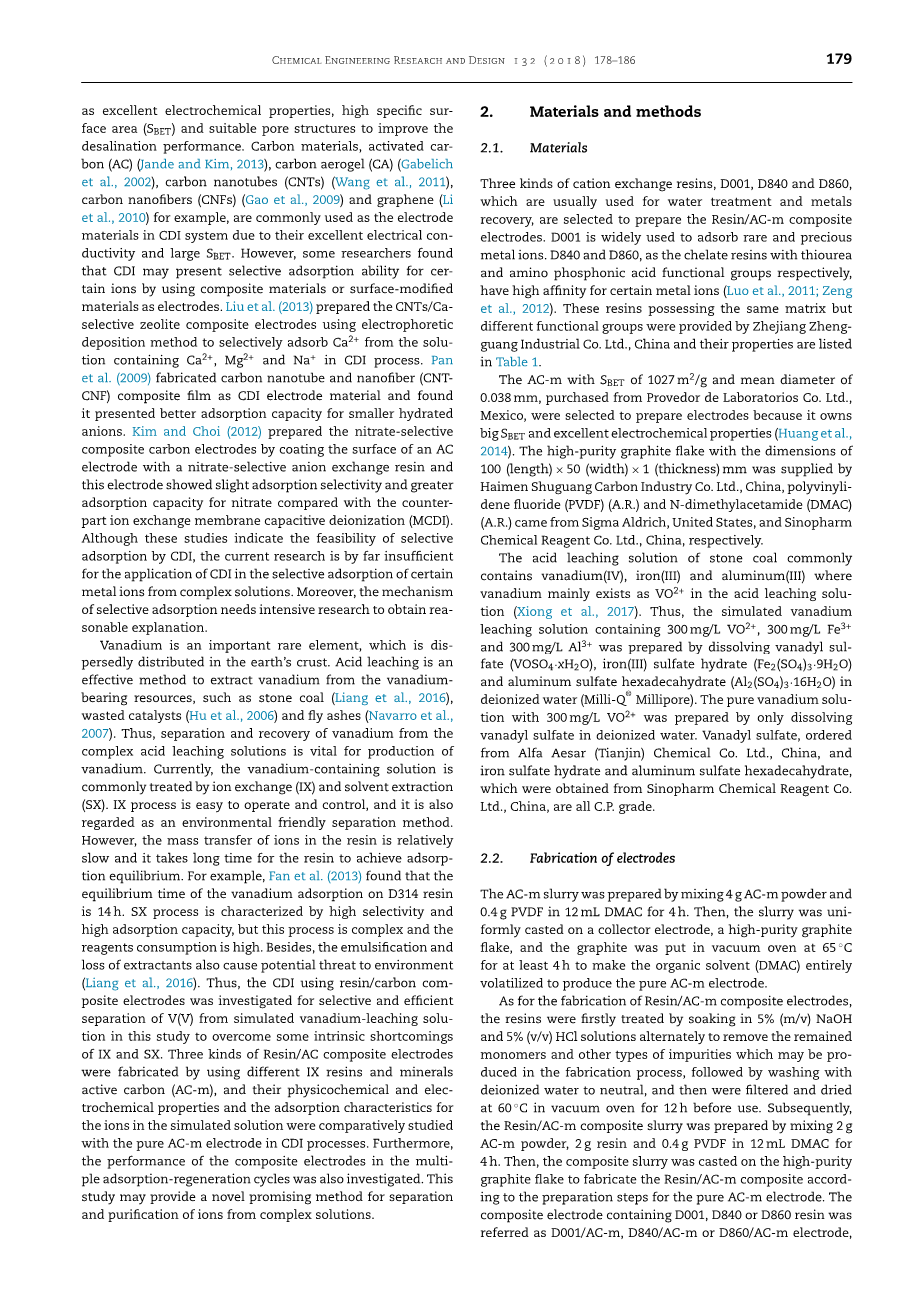 树脂/AC-m复合电极的制造,首先交替地浸泡在5%(m/v)NaOH和5%(v/v)HCl溶液中以除去残留单体和其它类型的杂质其可以在制造过程中产生,然后用去离子水洗涤至中性,然后在使用前在60℃的真空烘箱中过滤并干燥12小时。随后,通过将2gAC-m粉末,2g树脂和0.4gPVDF在12mLDMAC中混合4次来制备树脂/AC-m复合浆料H。然后,根据纯AC-m电极的制备步骤,将复合浆料浇铸在高纯度石墨薄片上以制造树脂/AC-m复合材料。含有D001,D840或D860树脂的复合电极分别被称为D001/AC-m,D840/AC-m或D860/AC-m电极。在制造过程中使用PVDF将浆料与石墨薄片粘合并赋予电极合适的机械强度。
