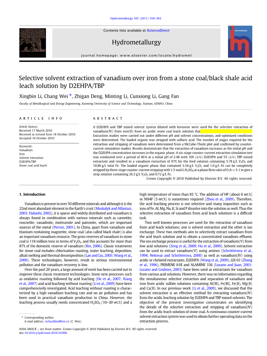 目前有两种熟知的方法用于从酸浸提液中萃取钒; 一种是溶剂萃取法,另一种是离子交换法。这两种方法旨在选择性地从酸浸提液中萃取钒,并获得浓缩的钒。离子交换过程可用于从低酸溶液中萃取钒(V)。溶剂萃取可用于使用胺萃取钒(V)以及使用酸性或螯合萃取剂的钒(IV)。D2EHPA,PRIMENE 81R和ALAMINE 336已被用作各种酸溶液中钒的萃取剂。然而,没有关于从含有Al(III),Fe(III),Fe(II),Mg(II)和Ca(II)的酸性硫酸盐溶液中同时选择性萃取和分离钒和铁的信息。在我们以前的工作中,我们讨论了溶剂萃取是一种从D2EHPA和TBP混合溶剂中萃取酸性浸出液中钒(IV)的有效方法。 本研究的目标集中于确定从石煤的酸性浸出溶液中选择性萃取和钒(IV)的剥离的细节。 使用连续的逆流溶剂萃取系统获得萃取过程的进一步操作数据。