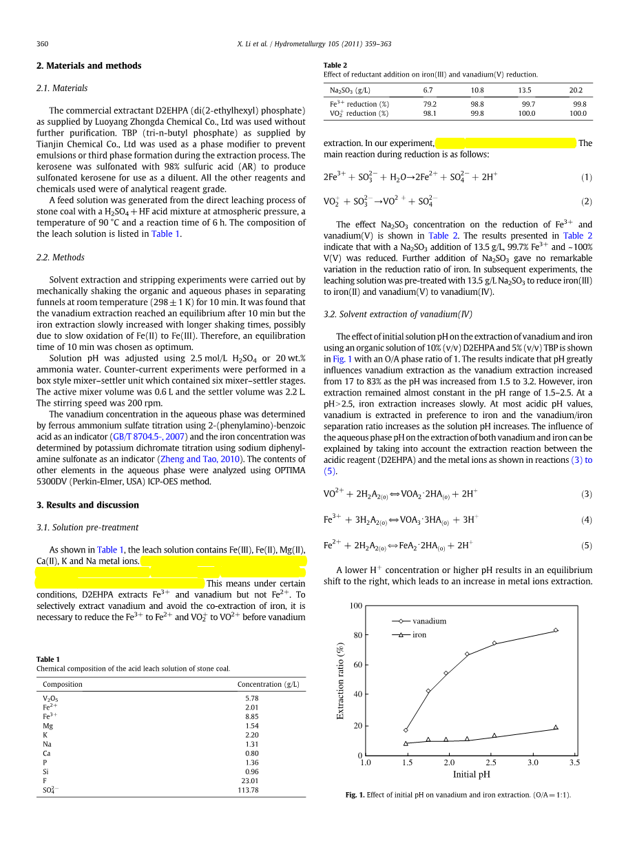如表格1所示,浸出溶液含有Fe(III),Fe(II),Mg(II),Ca(II),K和Na金属离子。D2EHPA pH萃取等温线显示萃取顺序为Fe3 、N 、VO2 、Ca2 、N Mg2 、N 、Fe2 、N 、K asymp;Na 。这意味着在一定的条件下,D2EHPA能萃取Fe3 和钒,但不萃取Fe2 。 为了选择性萃取钒并避免共萃取铁,有必要在钒之前将Fe3 还原成Fe2 和VO 为VO2 萃取。在我们的实验中,Na2SO3被用作还原剂, 还原期间的主要反应如下: