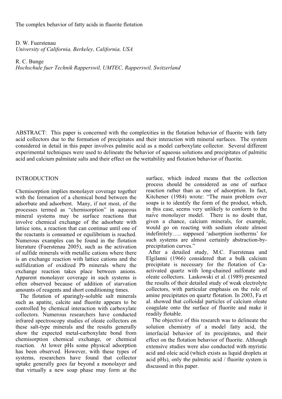 本研究的目的是描述典型脂肪酸的溶液化学、其沉淀物的界面行为以及它们对萤石浮选行为的影响。尽管还用肉豆蔻酸和油酸(其在酸性pH下作为液滴存在)进行了广泛的研究,但本文仅讨论了棕榈酸/萤石体系。
