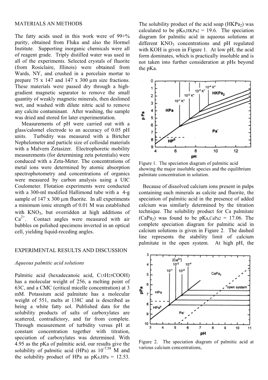 由于在含有方解石和萤石等矿物的矿浆中存在溶解的钙离子,所以在添加钙的情况下棕榈酸的形态只能通过滴定技术来确定。发现棕榈酸钙(CaPa2)的溶度积为pKs.CaPa2 = 17.06。图2给出了棕榈酸在钙溶液中的完整形态图。虚线代表开放系统中棕榈酸钙的稳定极限。 在高pH值时,碳酸盐浓度增加并最终以方解石沉淀。方解石的溶度积是pKs.CaCO3 = 8.23,萤石的溶度积pKs.CaF2 = 10.3。
