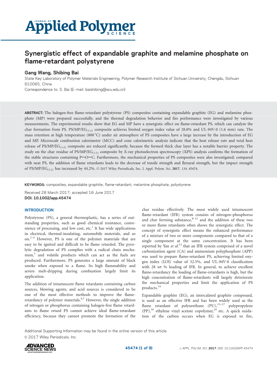本研究的目的是通过MP和EG的混合,制备具有优异性能的阻燃PS复合材料。阻燃剂的添加量控制在20% wt %,以保持良好的力学性能;同时,还发现了MP和EG之间的协同阻燃性能。由MP和EG产生的惰性气体可以有效地稀释氧气和可燃气体的浓度,形成的稳定膨胀的炭屏障起到了隔热和隔氧的作用,同时也阻止了在燃烧过程中聚合物熔体的滴注。通过UL-94垂直燃烧试验、LOI试验、微尺度燃烧量热计(MCC)分析、锥形量热分析和热重分析(TGA)对复合材料的可燃性和热降解性能进行了评价。用x射线光电子能谱仪对阻燃剂PS复合材料的炭渣进行了分析。