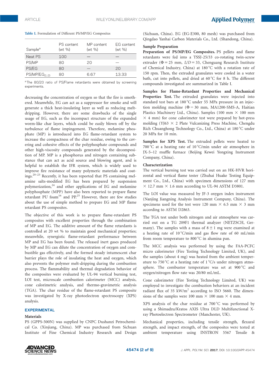 可膨胀石墨(EG),一种石墨层间化合物,作为一种有效的IFR,被广泛用作聚氨酯(PU)、聚丙烯(PP)[15-17],[18]乙烯醋酸乙烯共聚物,[19]等的阻燃剂,当它着火时,炭快速氧化膨胀以阻隔氧气,从而使得火熄灭。与此同时,EG可以起到抑制烟雾的作用,同时还能产生一层厚厚的隔热层以减少熔滴。然而,单独使用也有一些缺点,如膨胀的虫状炭层结构不紧凑,容易被火焰冲击的湍流吹走。因此,将三聚氰胺磷酸盐(MP)引入EG阻燃体系中,提高了炭渣的致密性,因为聚磷酸盐化合物和其他高粘度化合物的覆膜和粘结作用是由MP分解产生的。MP是一种含磷、含氮的物质,可以作为酸源和发泡剂,有助于形成IFR,广泛用于提高多种聚合物材料和涂料的耐火性能。[20]最近,据报道,含有三聚氰胺盐改性的EG的PS通过悬浮聚合而制得, [24]关于EG和三聚氰胺聚磷酸盐(MPP) 的其他应用如制备阻燃聚氨酯泡沫和聚丙烯泡沫。然而,很少有关于使用简单的用途的研究来制备EG和MP的PS阻燃复合材料。