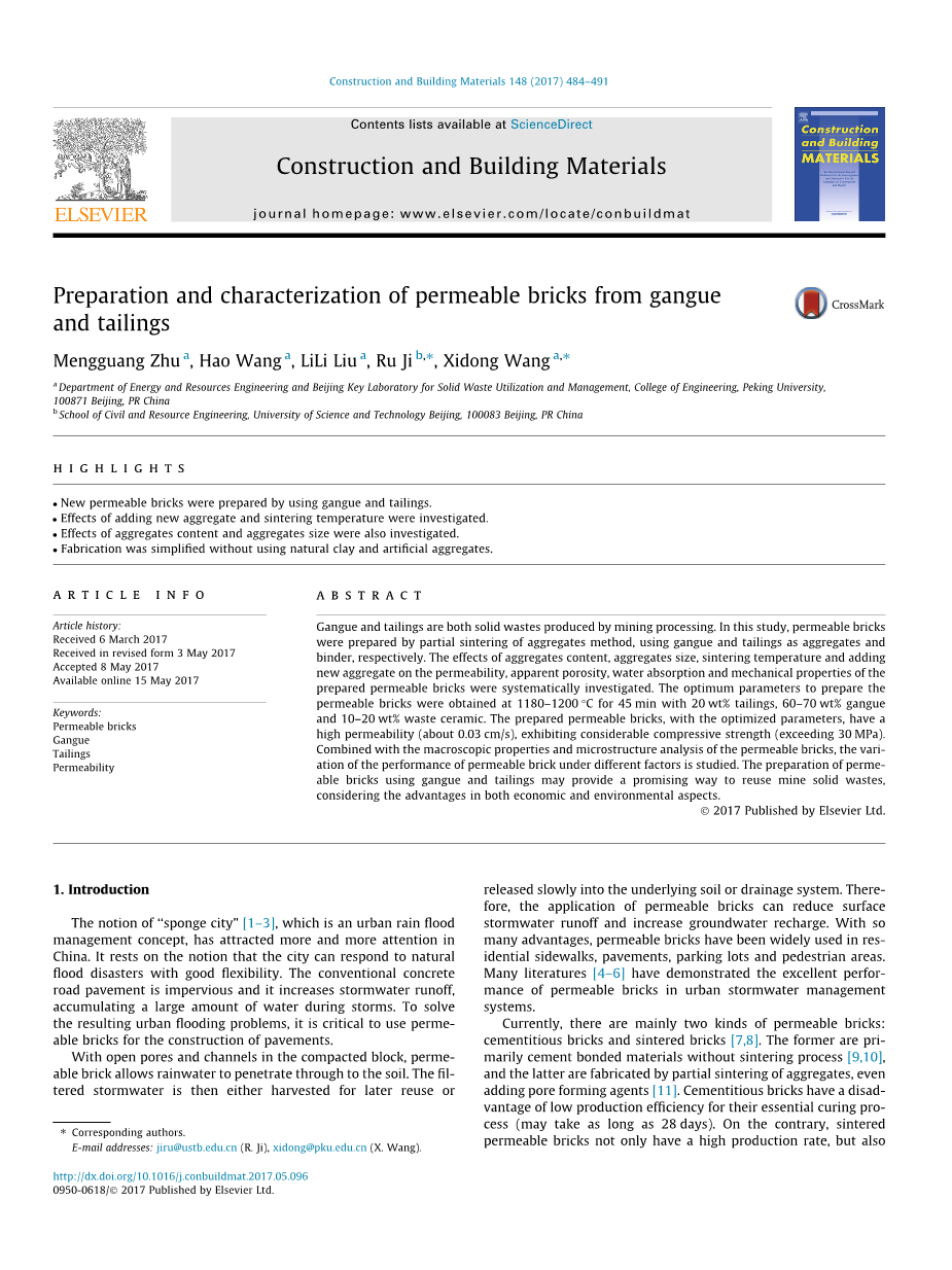 基于以上原因,本文提出了一种使用脉石和尾矿作为替代材料的方法。 脉石是一种商业上毫无价值的材料,它与矿床中所需的矿物环绕或密切混合。 通常,矿物加工前可将脉石作为废石分离,它适合作为骨料。 尾矿是矿物经加工过程后留下的物质,为了从矿石中提取有价值的部分通常会经过精细研磨,这些物质与天然粘土化学性质相似,可用作高温粘合剂。在目前的实践中,脉石和尾矿被堆放在尾矿库或被用于矿山回填,没有有效地利用。这些处理方式会浪费相关资源,占用大片土地并导致潜在的环境和安全问题,包括但不限于地表水,地下水和土壤的污染以及尾矿坝的破坏[18–20]。研究人员研究了使用不同类型的脉石或尾矿生产建设和建筑用砖[21–23]。然而,关于用脉石和尾矿制造透水砖的研究很少见。