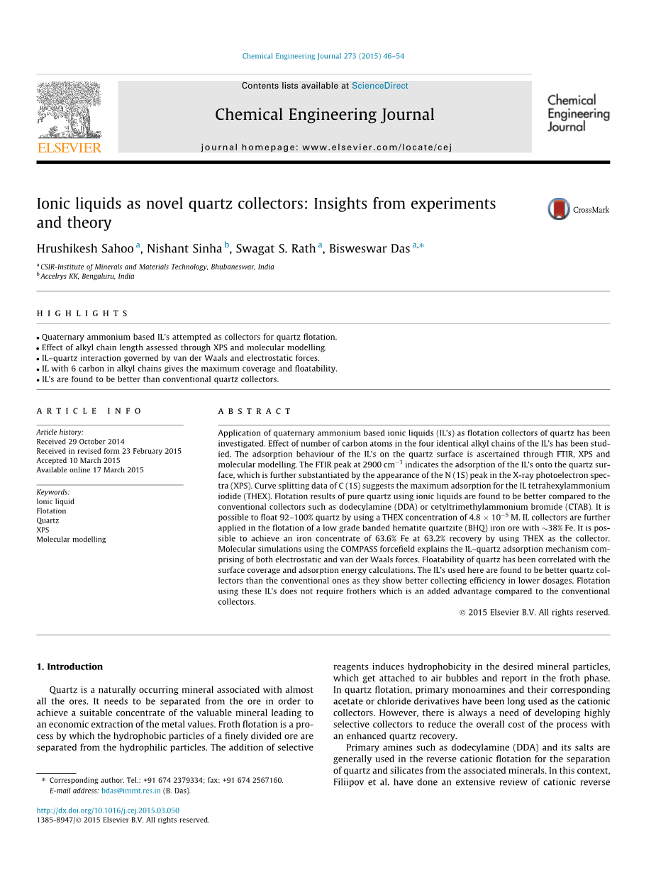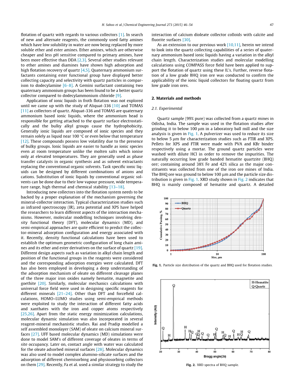 在研究Aliquat-336之前,没有探索离子液体在泡沫浮选中的应用[10] 和TOMAS[11] 作为石英的收集者。 Aliquat-336和TOMAS是基于季铵的离子液体,其中铵头部负责与石英表面静电连接,而庞大的烷基导致疏水性。 通常,离子液体由离子物质组成,并且它们在100℃左右或甚至低于该温度下保持为液体 [12]。 由于体积庞大的基团,这些化合物具有低挥发性。 与仅在高温下离子化的熔盐不同,即使在室温下,离子液体也容易作为离子物质处理。 它们通常用作有机合成中的相转移催化剂,并用作取代常规有机溶剂的溶剂萃取剂。 任务特定离子液体可以通过阴离子和阳离子的不同组合来设计。 由于它们蒸气压低,温度范围宽,热稳定性和化学稳定性高,可以用常规有机溶剂代替离子液体[13–18].