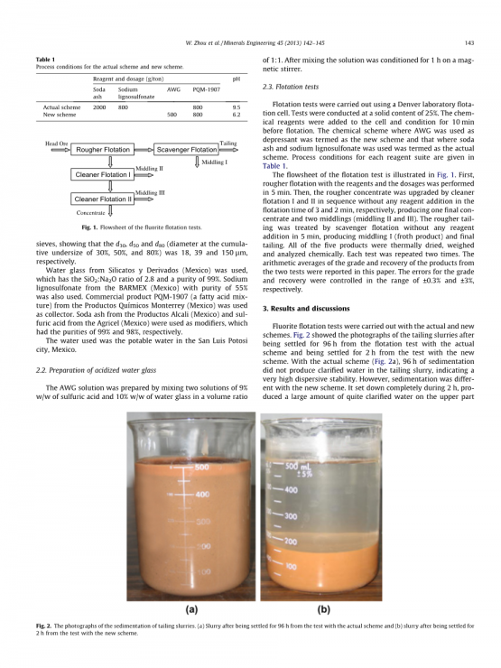 1. 实验结果表明,与纯碱和木质素磺酸钠相比,酸化水玻璃对拉斯库瓦斯矿的萤石浮选效果较好。它大大提高了尾矿浆中细颗粒的沉降速度,从而产生了更清洁的循环水,提高了萤石的回收率和浮选率。