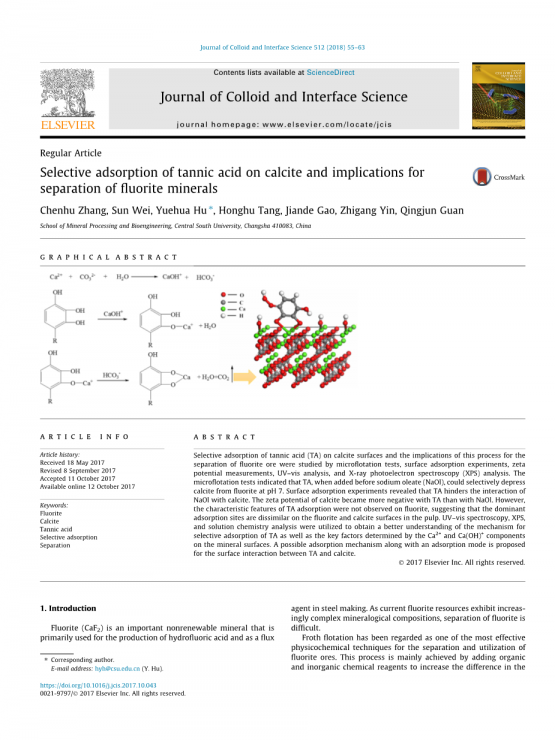 使用长链脂肪酸(例如油酸钠(NaOL))及其碱性盐作为捕收剂的浮选通常用于处理萤石矿物。Free and Miller [1] 提出脂肪酸在萤石和方解石上的吸附机理可归因于化学吸附,然后是烃链的物理吸附(双层形成)和随后羧酸钙在本体溶液中的沉淀。许多性质和参数,包括溶解度,表面种类,矿物表面电荷(Zeta电位)[2]和几个研究人员描述的捕收剂吸附密度,影响含钙矿物的浮选分离和吸附机制[3–5]。萤石和方解石的分离是很难的,因为它们具有相似的表面性质,并且它们都与阴离子试剂有高表面反应性[6–9]。但是,采用不同的抑制剂体系可以实现萤石和方解石矿物与阴离子捕收剂的选择性分离。