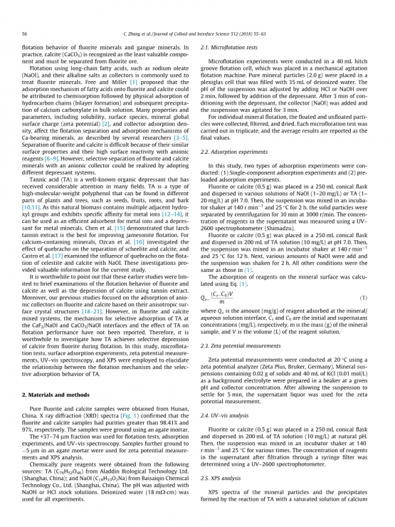 值得指出的是,这些早期的研究仅限于对萤石和方解石浮选行为的简要考察,以及单宁萃取物对方解石的抑制作用。此外,我们之前的研究主要是基于萤石和方解石表面各向异性的晶体结构来吸附阴离子捕收剂[18–21]。然而,在萤石和方解石混合体系中,没有报道在CaF2/ NaOL和CaCO3/ NaOL界面处选择性吸附TA的机理以及TA对浮选性能的影响。因此,TA如何在浮选过程中从萤石中选择性地抑制方解石值得研究。在这项研究中,利用微浮选试验,表面吸附实验,Zeta电位测量,紫外 - 可见光谱和XPS来阐明浮选机制和TA的选择性吸附行为之间的关系。