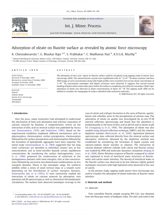 Over the years, many researchers had attempted to understand the mechanism of fatty acid adsorption and selective separation of calcium minerals by flotation. A comprehensive review on the interaction of oleic acid on mineral surface was published by Hanna and Somasundaran (1976) and Finkelstein (1989). Based on the experimental conditions employed, different mechanisms such as physisorption, chemisorption, surface precipitation, chemisorption followed by the surface precipitation and chemisorption followed by the formation of hydrophobic aggregates have been reported. The initial study (Somasundaran et. al., 1964) suggested that the long chain surfactants are adsorbed as individual counter ions at low concentrations and as hemi-micelles beyond certain equilibrium concentration. By considering the surface heterogeneities, Cases et al. (1986) proposed the condensation of surfactant at the homogeneous domains with most energetic sites at low concentrations followed by successive two dimensional condensations on less energetic domains. Hence in the monolayer range, the isotherm exhibits either a series of small vertical steps or a smooth curve depending on the distribution of surface energetic domains. Hanumantha Rao et al (1991a, b) have extensively studied the interaction of oleate on calcium minerals by adsorption, zeta potential and IR spectroscopy as well as theoretical thermodynamic calculations. The authors have observed monolayer coverage in the case of calcite and a bilayer formation in the cases of fluorite, apatite, baryte and scheelite, prior to the precipitation of calcium soap. The adsorption of oleate on apatite was investigated by ex-situ FT-IR internal reflection spectroscopy and found that the adsorbent is predominantly in the form of oleic acid at pH 8.0 and as oleate at pH 9.5 (Yongqiang Lu et al., 1998). The adsorption of oleate was also studied using infrared reflection technique (DRIFT) and the solution depletion method (Mielczarski, et. al., 2000). Agreement between spectroscopic data collected directly from the mineral surface and adsorption isotherms obtained by the depletion method was established by considering the formation of liquid crystals and calcium-sodium oleate micelles in solution. The interaction of calcium dioleate collector colloids with calcite and fluorite surface was studied by AFM and molecular dynamics simulation (Keqing Fa et al., 2006). Better flotation response of fluorite compared to calcite was explained in terms of interfacial water structures at fluoritewater and calcite-water interface. The density of interfacial water at the fluorite surface was observed to be low whereas tightly packed monolayer structures with high hydration were observed in the case of calcite.