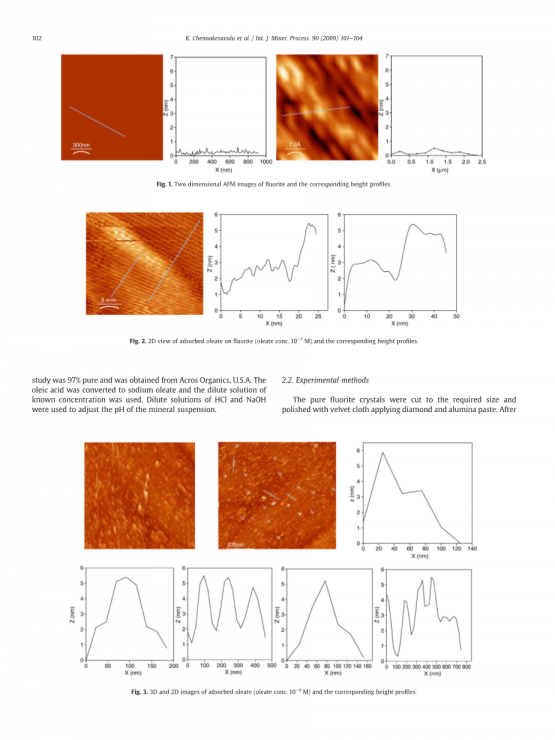 The pure fluorite crystals were cut to the required size and polished with velvet cloth applying diamond and alumina paste. After polishing, the samples were thoroughly washed with double distilled water. After equilibrating the samples with oleate solutions for half an hour, the samples were taken out from oleate solution and dried at 100 °C in oven. AFM images were collected with a commercial instrument, Nano-scope III a (Veeco, Santa Barbara, CA). All the images were collected in air by tapping mode AFM using Phosphorus (n) doped silicon cantilever probe at 1 Hz scan rate and 256 lines per sample.