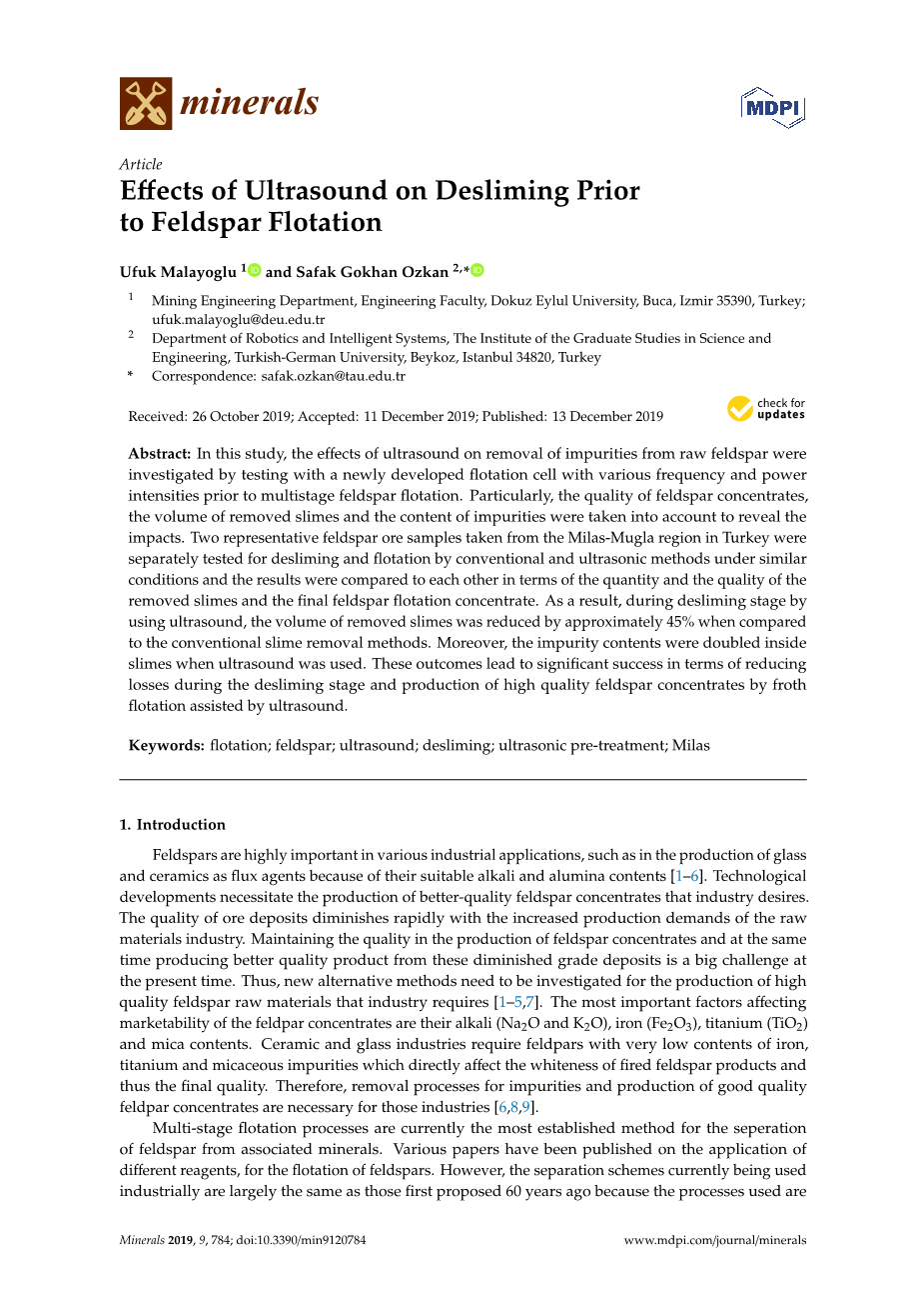 摘要:在这项研究中,通过在多级长石浮选之前用新型开发的具有不同频率和功率强度的浮选槽进 行测试,研究了超声波对从长石中去除杂质的影响。特别是,将长石精矿的质量,去除的煤泥的体