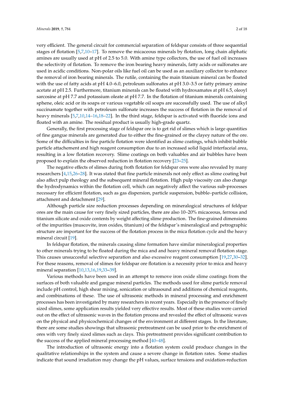 已经尝试了各种方法来尝试从有价值的和脉石矿物颗粒的表面去除氧化铁粘液涂层。用于去除粘液颗粒的方法包括pH控制,高剪切混合,超声或超声和添加化学试剂,以及这些的组合。近年来,许多研究人员已对在矿物加工和富集过程中使用超声波方法进行了研究。特别是在存在细粒度的粘液的情况下,某些应用结果产生了非常有效的结果。这些研究大多数是针对浮选过程中超声波的影响进行的,揭示了超声波对不同阶段环境的物理和物理化学变化的影响。在文献中,有一些研究表明,在用非常细小的粘液(如粘土)富集矿石之前,可以使用超声波预处理。这种预处理为成功应用矿物加工方法[40–48].