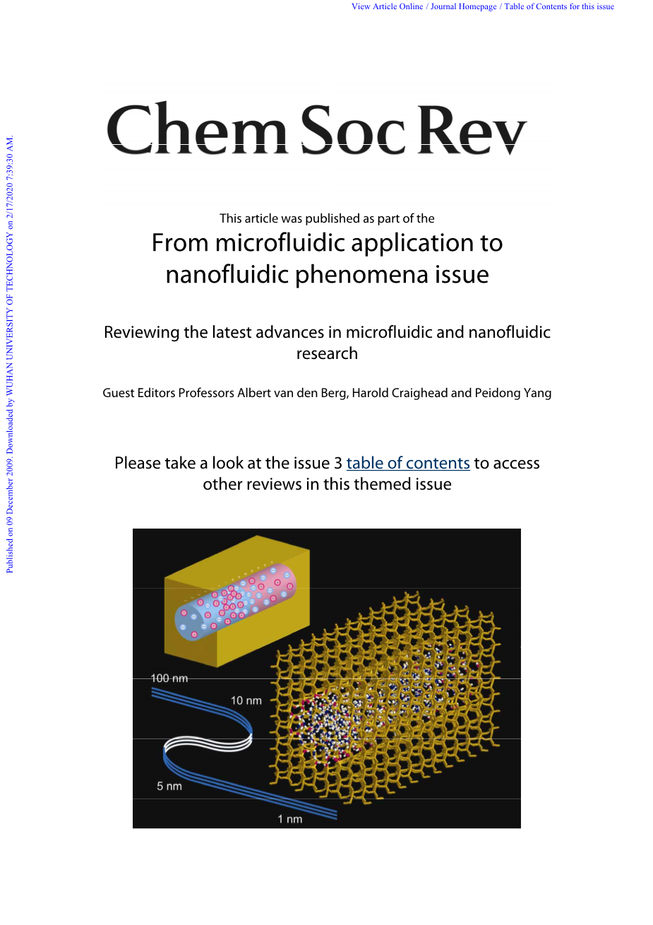 在专题综述中,报道了纳米流体在建模与实验研究方面的最新进展。纳米流体的研究根据其特征长度分为两种。当纳米通道和孔隙的尺寸为5-100 nm时,静电相互作用占主导地位,并且离子与流体流动可以通过连续体动力学进行分析。各种纳米流体装置被使用在纳米尺度上处理水溶液和生物分子。这类系 统的成功开发对于侧重水净化和复杂生物溶液处理的技术具有重大影响。当尺寸小于5nm时,通过随机与分子动力学分析发现,空间相互作用和水合作用会影响离子和流体流动。