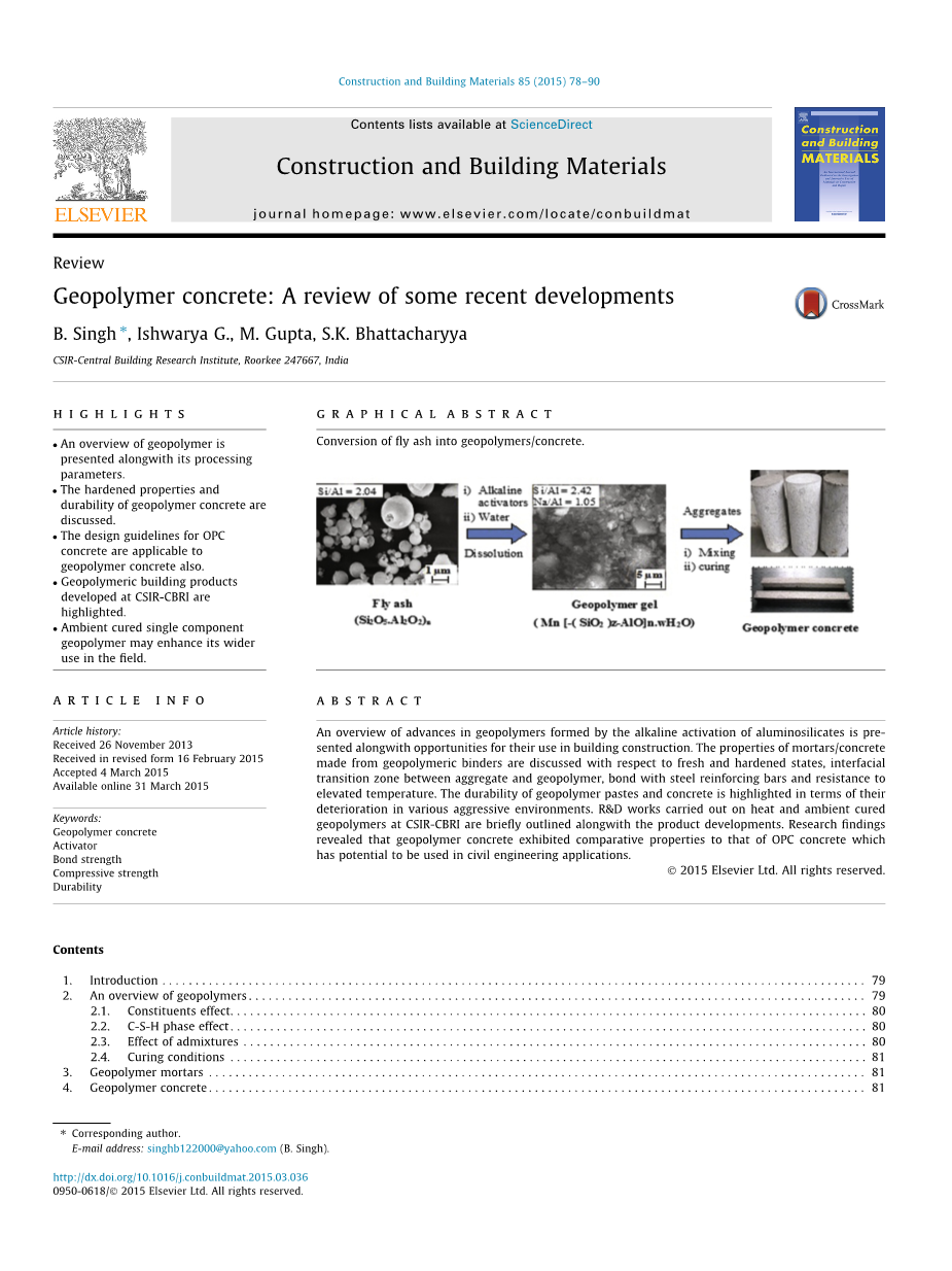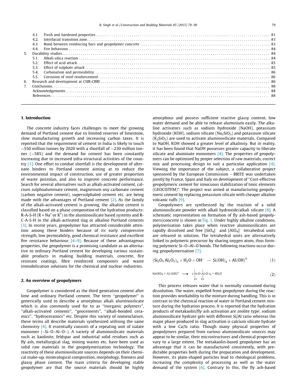 概述了碱性铝硅酸盐活化形成的地聚物的研究进展,并展望了其在建筑施工中的应用前景。讨论了地聚物结合剂配制的砂浆/混凝土的新拌状态和硬化状态、骨料与地聚物的界面过渡区、与钢筋的粘结和抗高温的性能。地聚物浆体和混凝土的耐久性是通过在各种恶劣环境中的侵蚀体现出来了的。概述了CSIR-CBRI公司在热固化和常温固化地聚物方面的研发工作,以及产品开发情况。研究结果表明,地聚物混凝土具有与OPC混凝土相当的在土木工程中潜在的应用价值。