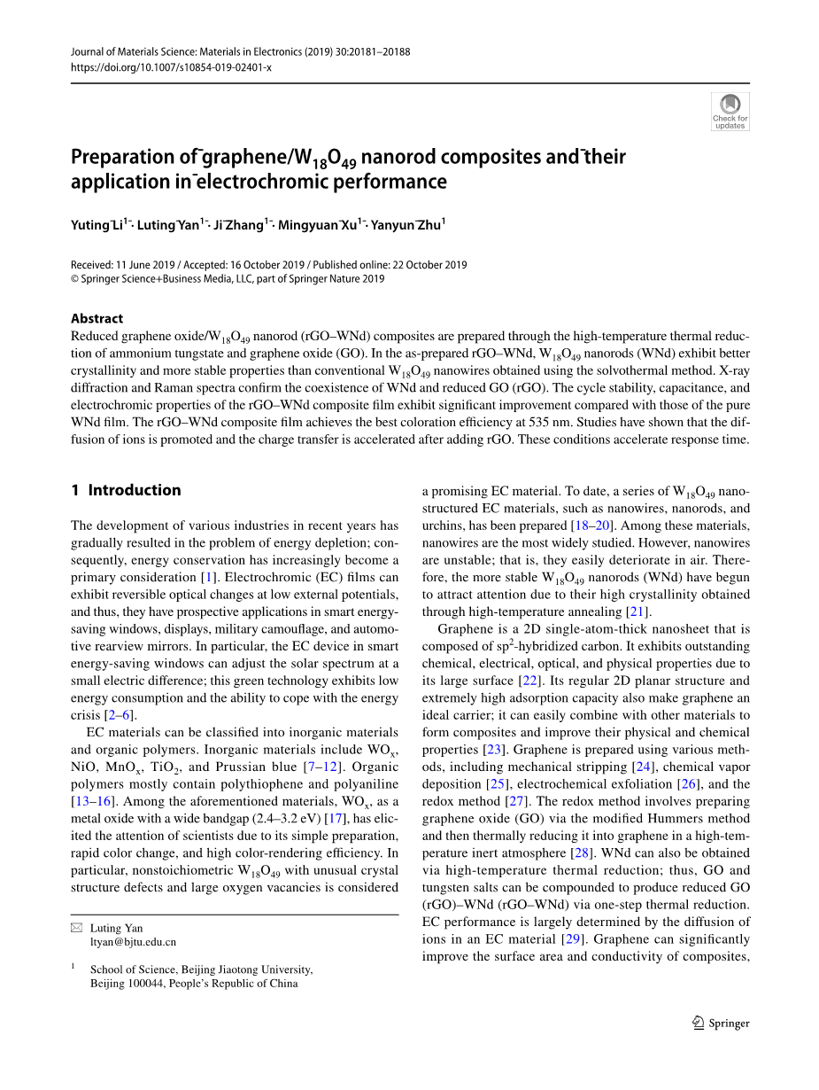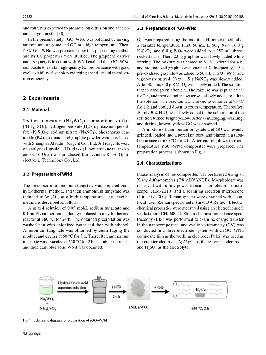 石墨烯是由sp2杂化碳构成的二维单原子厚纳米片。由于其巨大的表面,它具有优异的化学、电学、光学和物理性能[22]。其规则的二维平面结构和极高的吸附容量也使石墨烯成为理想的载体;它可以很容易地与其他材料结合形成复合材料,提高其物理和化学性能[23]。石墨烯的制备方法多种多样,包括机械剥离法[24]、化学气相沉积法[25]、电化学剥离法[26]和氧化还原法[27]。氧化还原方法包括通过改进的Hummers方法制备氧化石墨烯(GO),然后在高温惰性气氛中热还原为石墨烯[28],还可以通过高温热还原获得WNd。因此,GO和钨盐可以通过一步热还原合成还原GO(rGO)–WNd(rGO–WNd)。EC性能主要取决于离子在EC材料中的扩散[29]。石墨烯能显著改善复合材料的比表面积和导电性,因此有望促进离子扩散和加速电荷转移[30]。