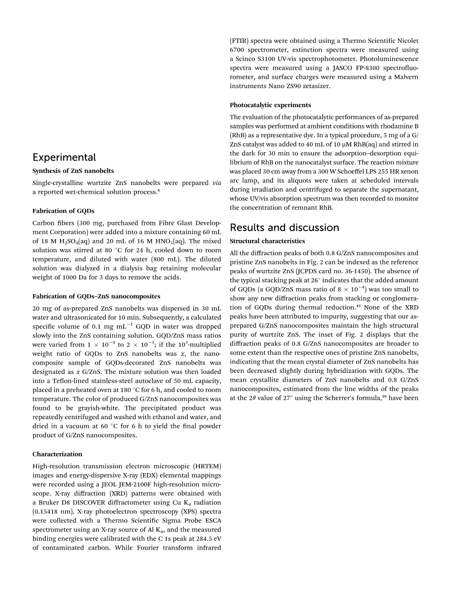 相比于传统的基于有毒重金属的量子点,石墨烯量子点(GQD)无毒、便宜、不含重金属且对环境友好,因此备受关注,因为传统量子点会导致严重的健康和环境问题。GQDs由于其光诱导的电子转移特性可用于光催化应用。30,31此外,GQDs在普通溶剂中的良好分散性使其有望在各种湿法加工的应用。32因此,ZnS和GQDs的组合似乎是一种通过阻碍电荷重组来改善电荷分离从而提高光催化效率的理想手段。