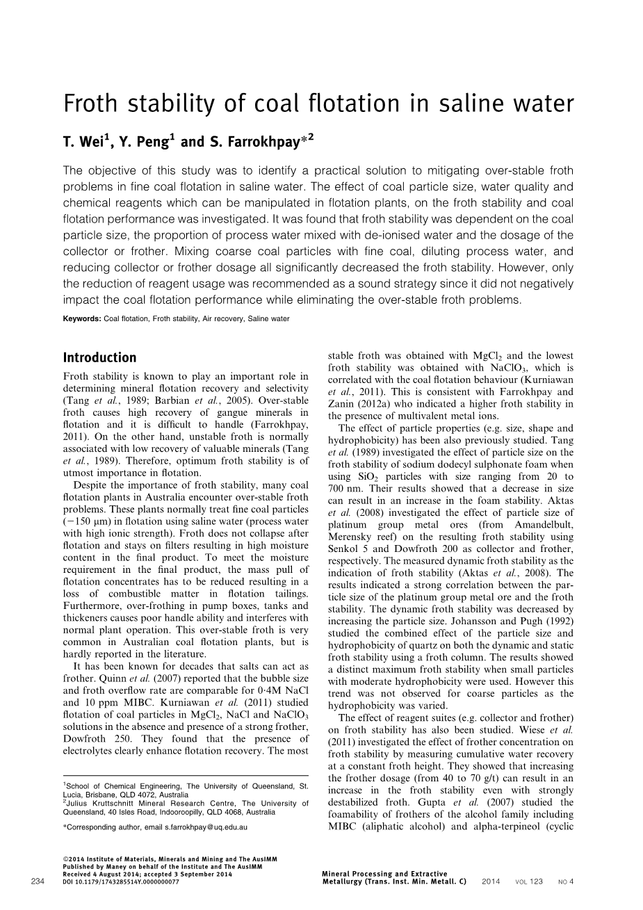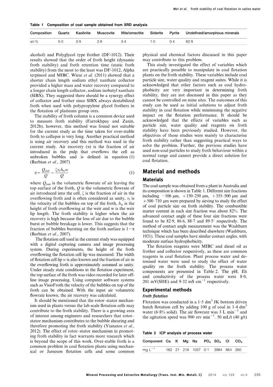 关键词:煤浮选;泡沫稳定性;空气回收;盐水
