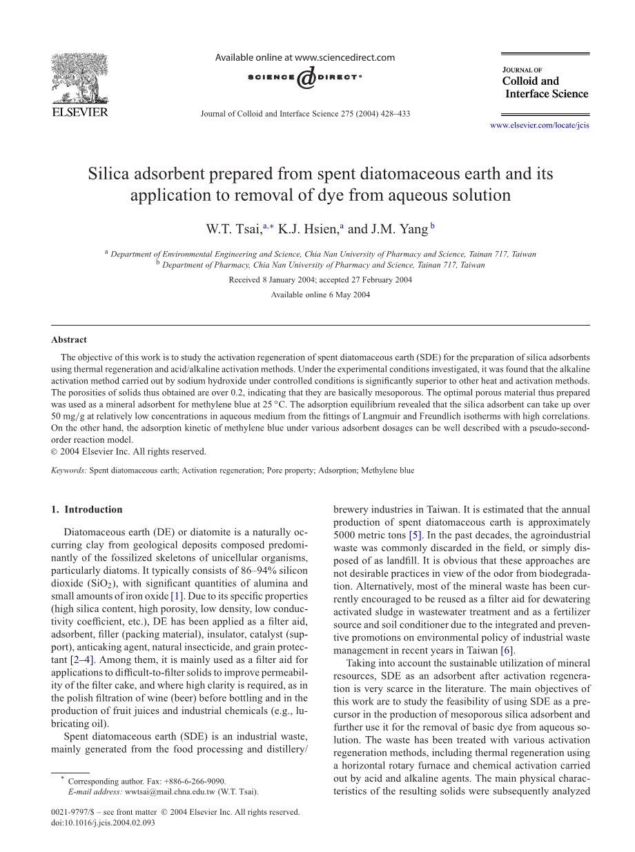 关键词:废硅藻土;活化再生;孔隙特征;吸附作用;亚甲蓝