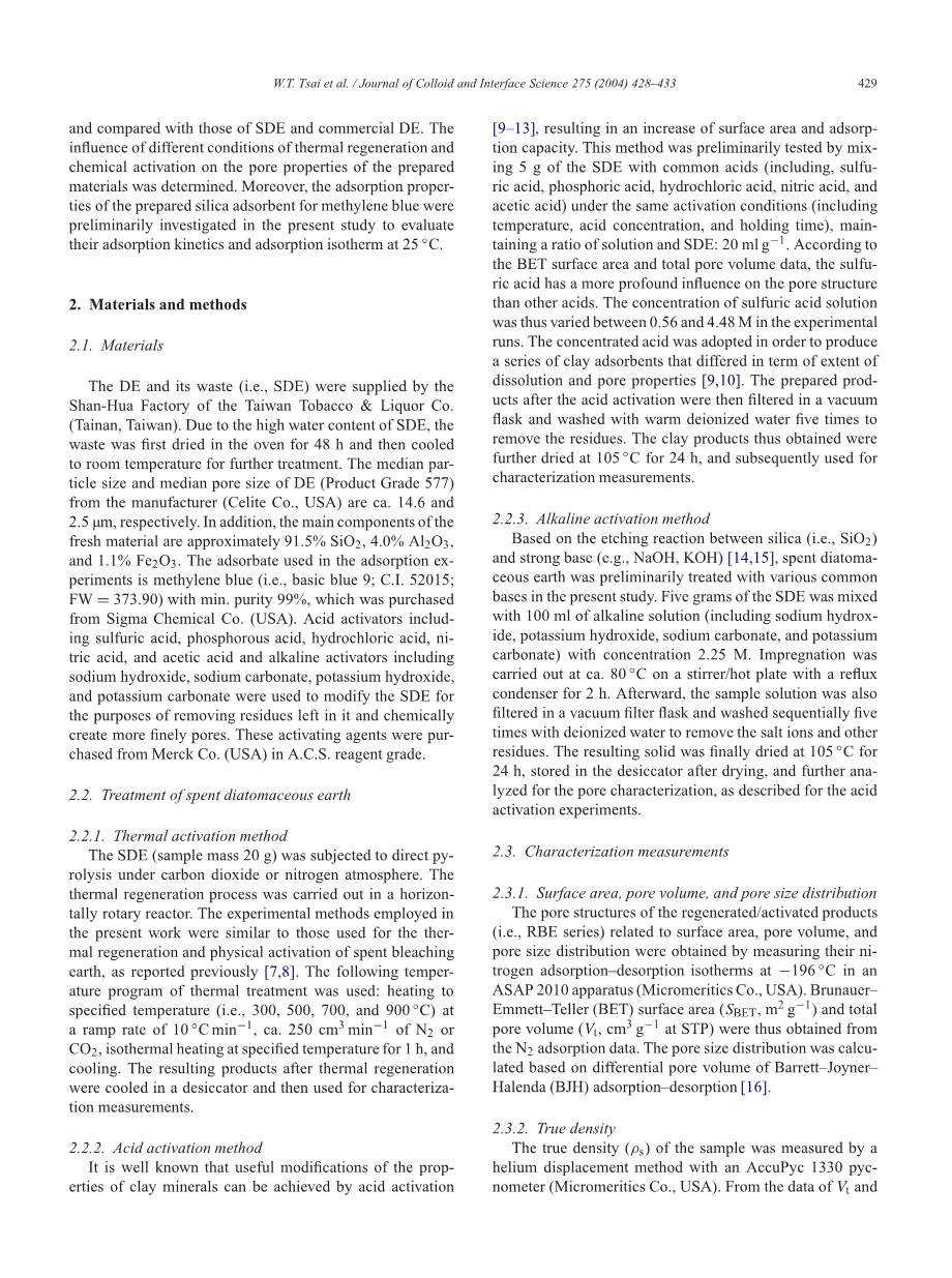 如表2中所示,使用硫酸活化处理的样品的孔隙特征和DE的孔隙特征稍微的接近(即2.85-3.78m2/g对比4.21m2/g),并且尤其大于SDE的孔隙特征(即2.85-3.78m2/g对比0.2m2/g)。然而,在粘土矿物(例如,蒙脱石)中,酸浸和渗透似乎没有继续向内进入,而是从颗粒的边缘的现有的孔结构而进入到矿物的内部,留下具有大表面积的框架。也就是说,二氧化硅和氧化铝的复合结构和硅藻土的刚性矩阵结构不容易被影响或通过氢离子在界面中和。在表2中,观察到所得到的固体的真实密度与孔隙特征保持一致,表明使用硫酸活化的过程中,进行反应和溶解的氢离子消除了更多的非结晶矿物和残留物中废硅藻土的金属离子,从而增加了试样的真密度。