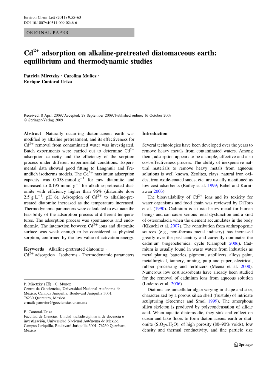 碱处理硅藻土对Cd2 的吸附平衡与热力学研究