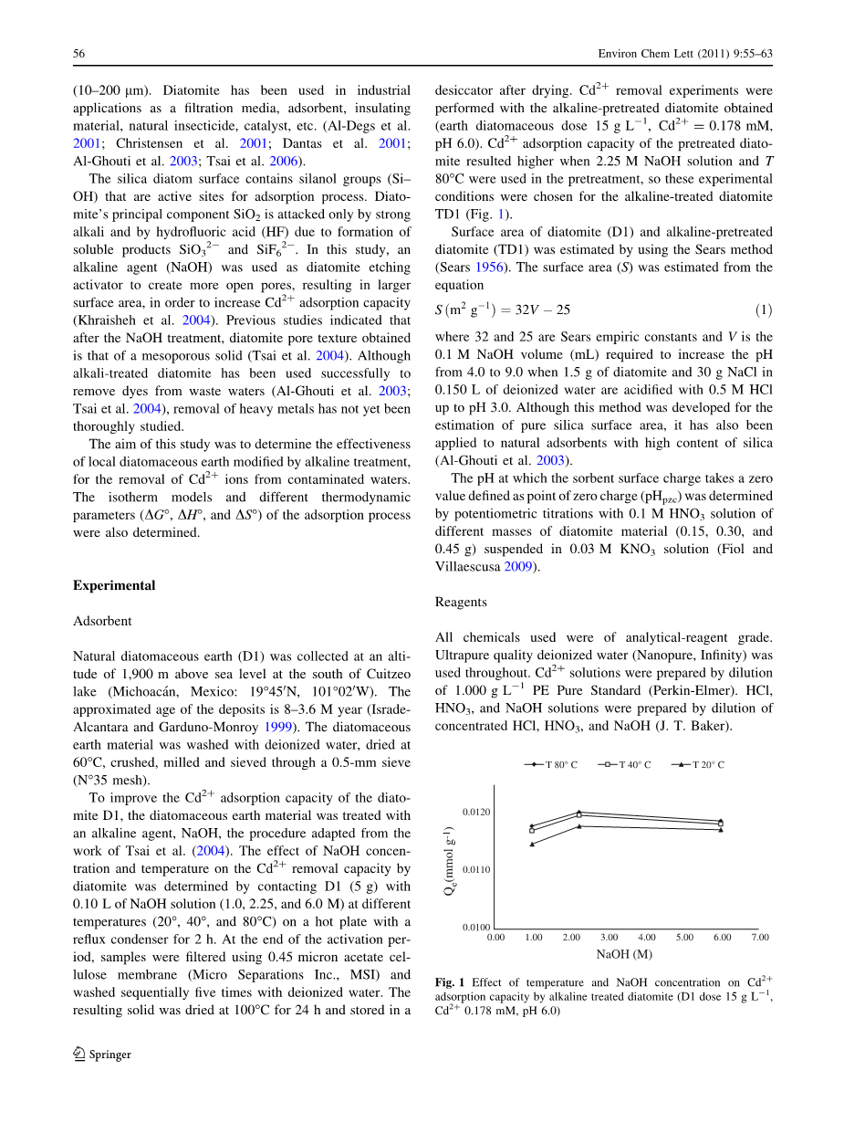 为提高D1硅藻土对Cd2 的吸附能力,对硅藻土用碱性试剂NaOH进行处理,该过程改编自于(Tsai et al (2004)。取5gD1硅藻土样品与0.1LNaOH(16mol/L,2.256mol/L,6mol/L)在容器内混合,将容器分别置入20℃、40℃、60℃的回流冷凝器中2h,用于测定氢氧化钠的浓度和吸附温度对硅藻土吸附镉能力的影响。用碱改性后,将样品用0.45微米醋酸纤维素过滤(微分离公司,MSI)并用去离子水连续洗涤五次。清洗完成后,在100℃下用烘箱烘干24h,并储存好样品。用碱改性后处理后的硅藻土进行Cd2 去除试验。(硅藻土用量15g/L,Cd2 为0.178mmol/L,PH=6.0)。当的NaOH浓度为2.25mol/L,温度为80℃时,改性后的硅藻土TD1对Cd2 的吸附量最高。用西尔斯法估计天然硅藻土D1和改性后的硅藻土TD1的比表面积。比表面积(S)的估计方法为S(m2/g)=32V-25