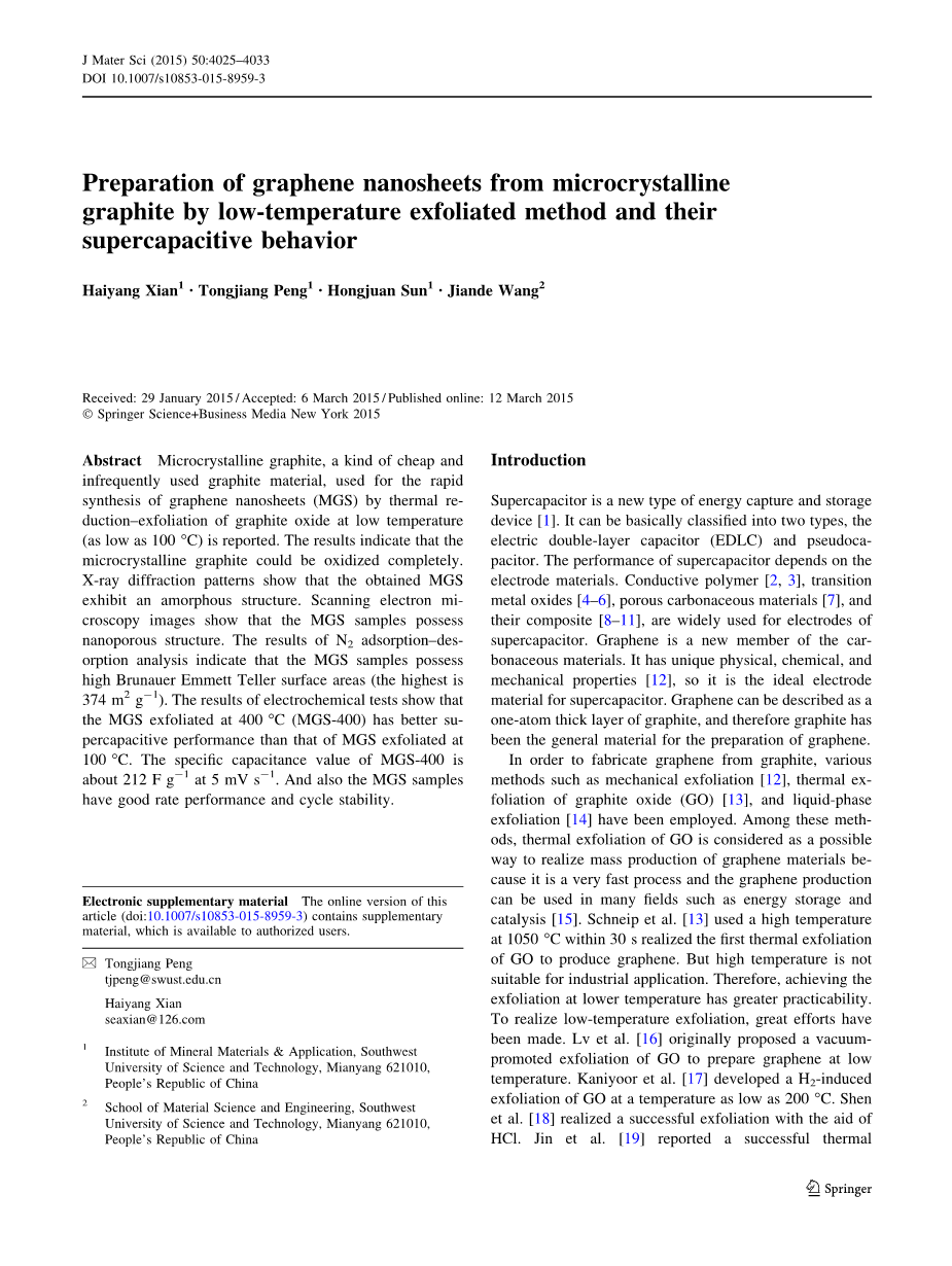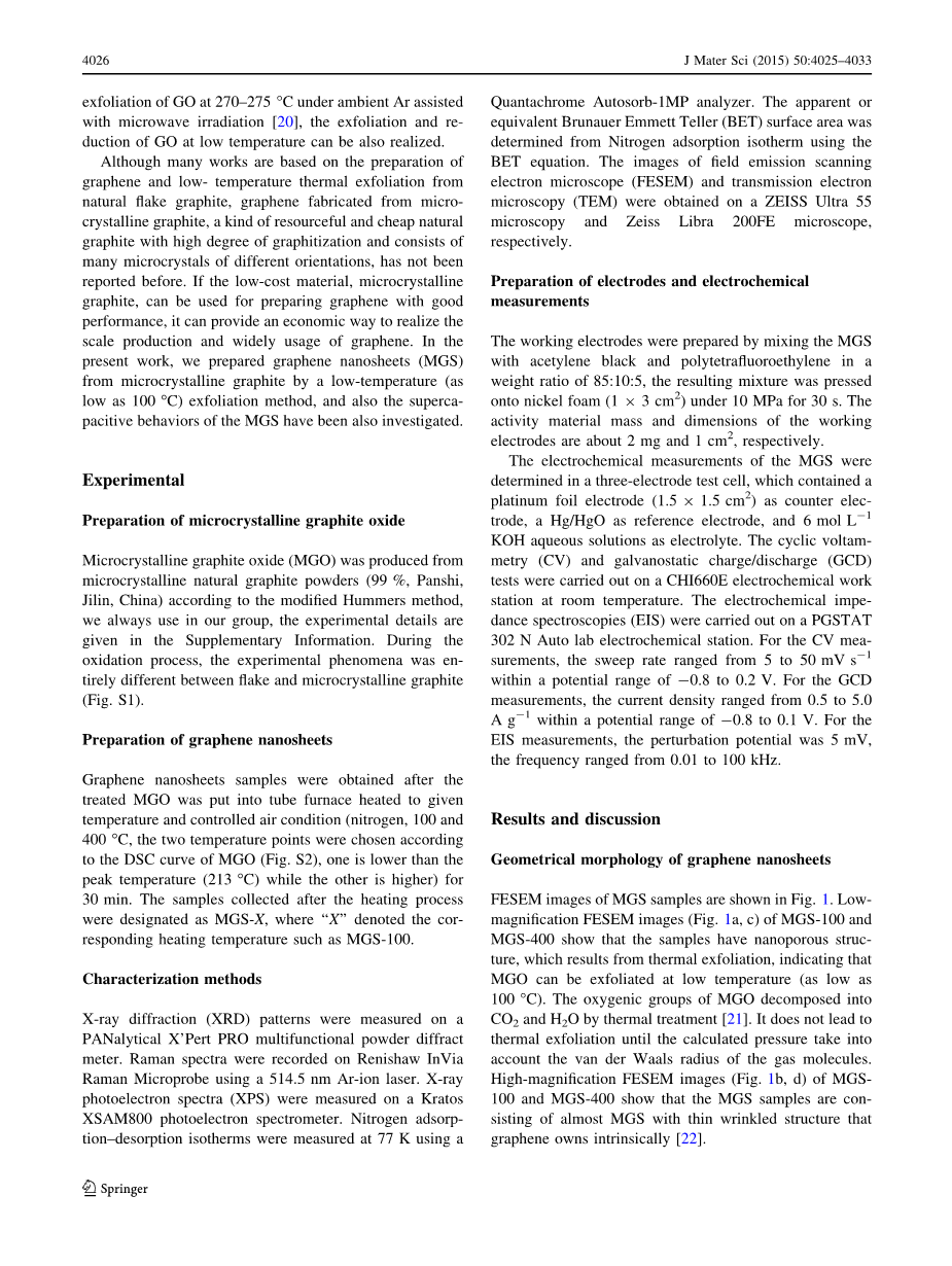 微晶石墨,是一种廉价和不经常使用的石墨材料,用于热石墨烯还原-纳米片的快速合成(MGS)。据报道在低温下氧化石墨(低至100℃)的剥离结果表明,该微晶石墨可以被氧化完全.X射线衍射图案显示,所获得的MGS呈无定型结构。扫描电子显微镜图像显示,MGS样品具有纳米多孔结构。N2吸附-脱附分析的结果表明,该MGS样品具有高的布鲁诺尔埃米特特勒表面区域(最高是374平方米G-1)。电化学试验的结果表明,该MGS在400℃(MGS-400)剥离的具有比MGS的在100℃剥离更好超级电容性能。MGS-400的比电容值约为212°FG-1以5mV-1。所以MGS样品具有良好的速度性能和循环稳定性。