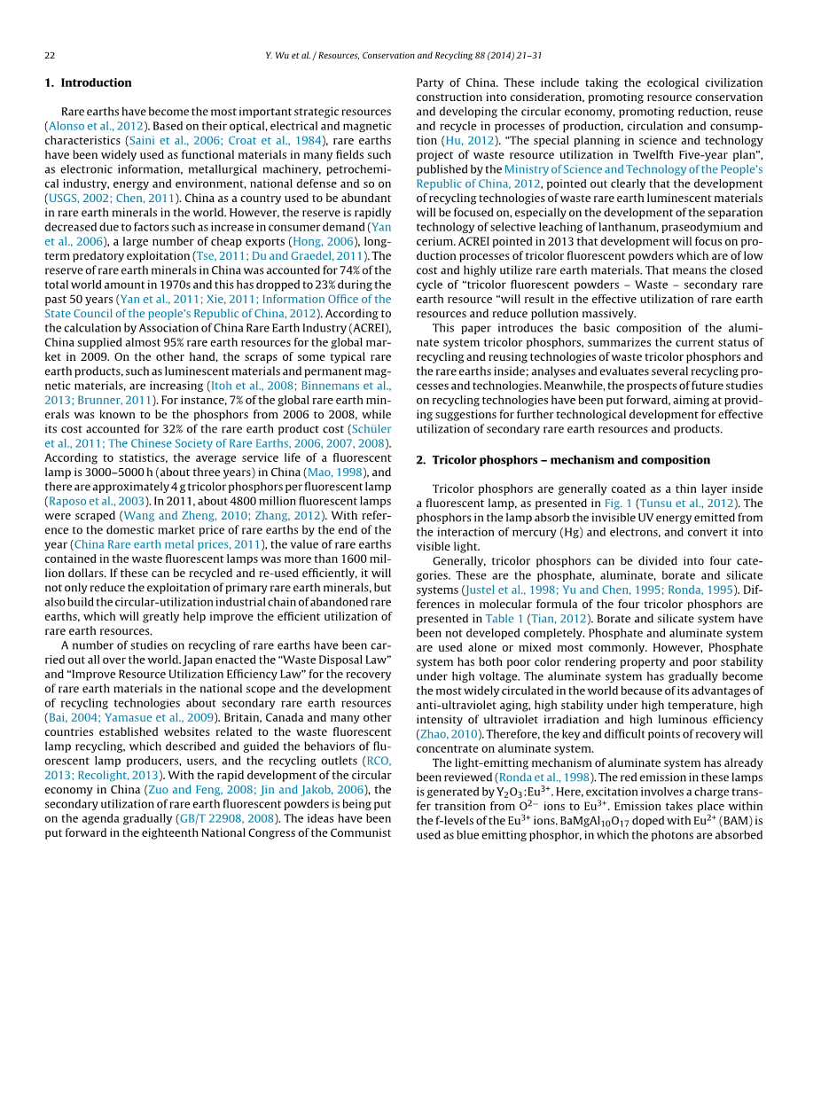 一些关于稀土回收的研究已经开始,在世界各地兴起。日本颁布了“废物处理法”和“提高资源利用效率法”,在国家范围发展关于二次稀土资源的回收技术。英国,加拿大等等国家建立了与荧光灯相关的网站回收体系,描述和指导流感病毒的行为,orescent灯生产商,用户和回收网点。随着经济的快速发展,在中国二次利用稀土荧光粉投入使用正在逐渐提上日程。这些想法是在共产党第十八次全国代表大会上提出。包括采取生态文明建设考虑,促进资源节约发展循环经济,促进减排,再利用并在生产,流通和消费过程中循环利用,重刑。“科技专项规划“十二五”期间废物资源利用工程“在公布的财政部,人民的科学与技术共和国中国,2012,明确指出发展废稀土发光材料的回收利用技术将重点放在发展分离上选择性浸出镧,镨和镨的技术铈。ACREI指出,2013年,三色荧光粉的制造工艺低成本高,利用稀土材料。这意味着关闭循环“三色荧光粉-废料-二次稀有地球资源“将有助于稀土的有效利用资源大量减少污染。本文介绍了铝-nate系统三色荧光粉,总结当前的废旧三色荧光粉的再利用技术,稀土分析技术,评估了几个稀土回收利用的技术。同时,未来研究的前景提出了循环再生技术,为进一步技术开发提出有效的建议和二次稀土资源产品的利用。