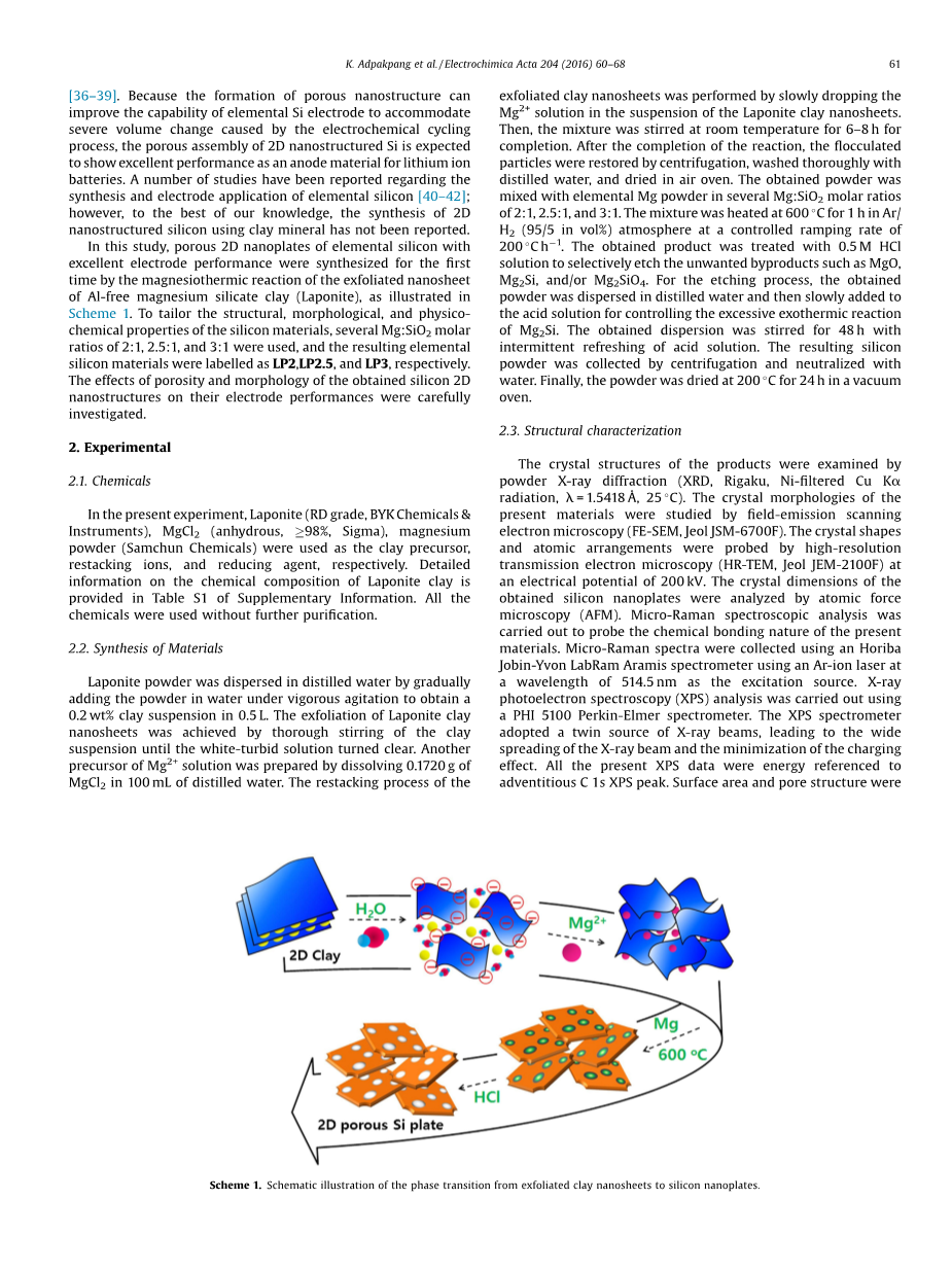 化石燃料消耗的不断增加唤醒人们对更可持续能源的发现和二次电池等储能技术的发展。因此,世界范围内对高性能二次电池的需求日益增长,从而引发了对锂离子电池新型高效电极材料的大量研究。与正极材料相比,负极材料的低工作电位使得其电极性能具有多种非插层的工作原理,这使得锂二次电池新型负极材料的设计和探索得到了长足的进步。迄今为止,各种类型的材料,如元素、合金和氧化物,都被研究成负极。其中,单质硅因其4200mAh/ g的巨大理论容量而受到特别的关注,其理论容量大于任何其他材料。然而,Si必须经受苛刻的环境,在电化学循环过程中,由于电极活性依赖于锂合金的脱氧过程,导致容量衰减,体积变化较大。通过控制孔隙率对纳米结构进行剥离,是优化阳极材料电极性能的最有效方法之一。虽然利用Si4 前驱体进行形貌控制合成氧化硅的方法已经很成熟,但是自由控制单质Si的形貌和孔隙率并不容易。由于Si4 离子不易还原为Si族,因此在硅基材料的研究中,多数采用单质Si代替Si4 化合物作为前驱体。近年来,有关硅藻、农业废弃物、天然砂等天然硅基材料的镁热还原反应合成硅电极材料的报道较多。虽然人们对天然硅材料还原为单质硅的研究很多,但多孔纳米硅材料的二维形貌尚未建立。因此,我们的目的是将镁热还原法应用于以硅酸盐粘土为原料合成二维纳米硅元素。由于多孔纳米结构的形成可以提高单质硅电极对电化学循环过程引起的体积剧烈变化的适应能力,因此作为锂离子电池的负极材料,二维纳米硅多孔组装有望表现出优异的性能。关于单质硅的合成和电极应用的研究已有很多报道。然而,据我们所知,利用粘土矿物合成二维纳米硅的研究尚未见报道。