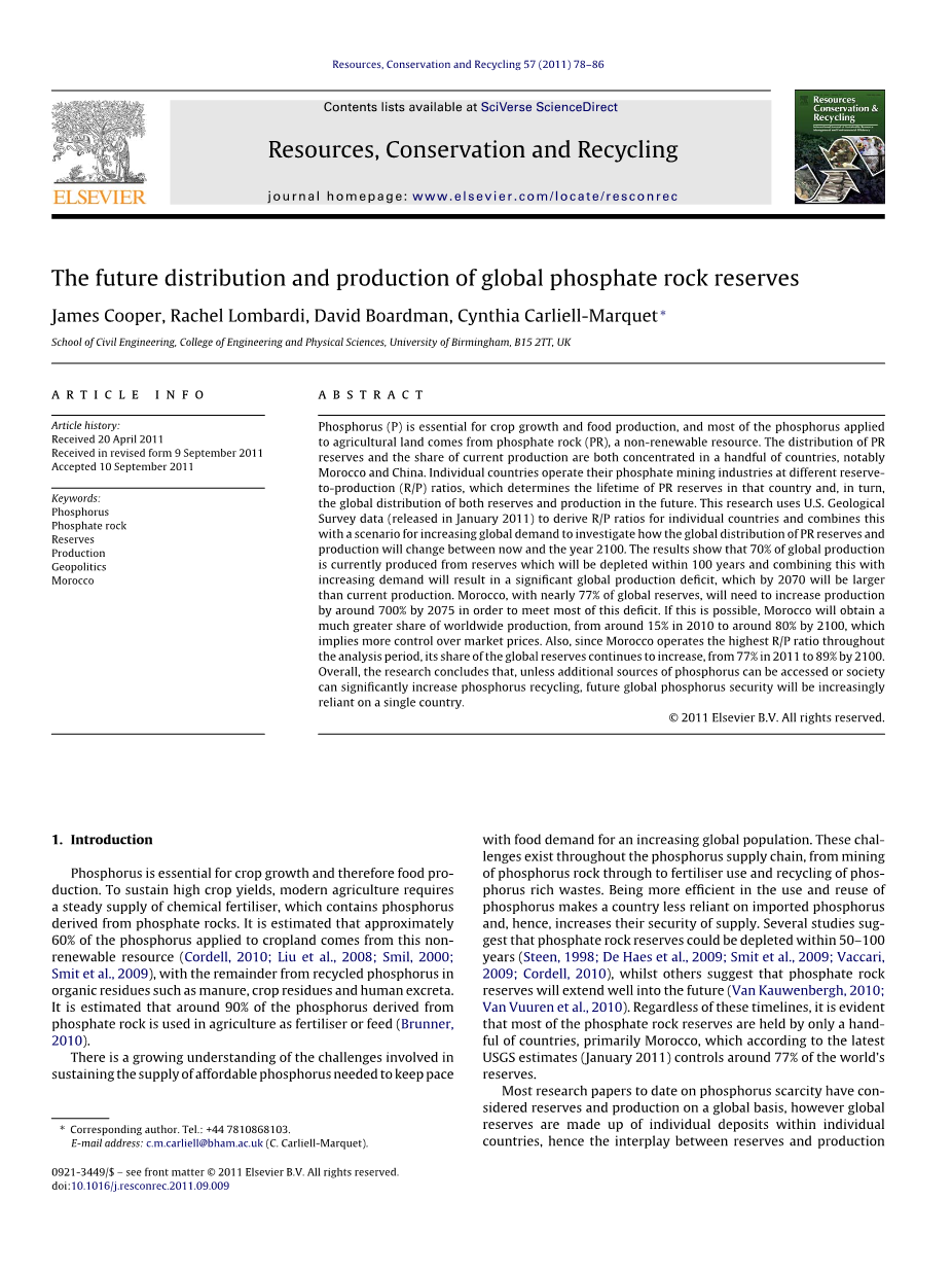 本文考虑了各个国家的储备与生产之间的关系(储备与生产比率)如何影响到21世纪的磷供应格局。