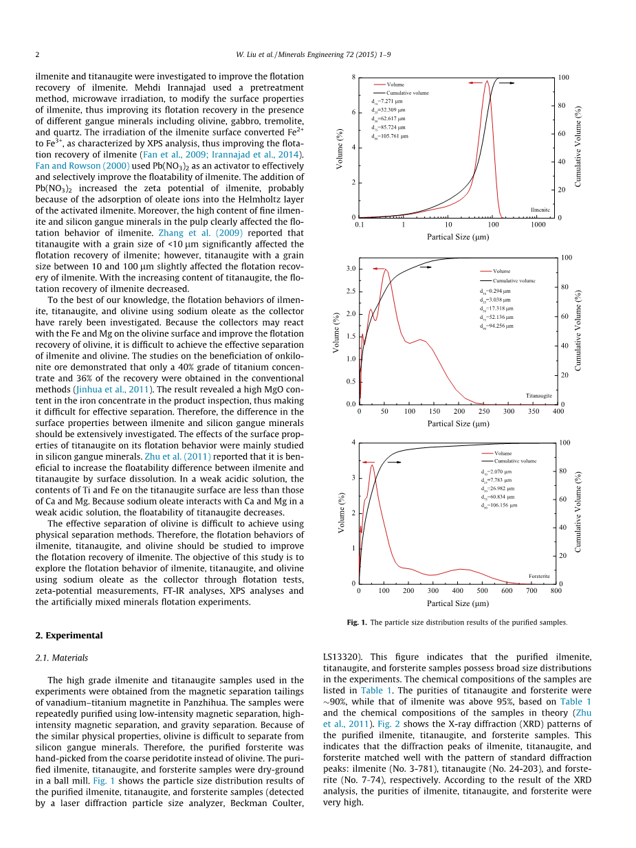 实验中使用的高品位钛铁矿和钛辉石样品来自攀枝花钒钛磁铁矿的磁选尾矿。使用低强度磁分离,高强度磁分离和重力分离重复纯化得到样品。由于具有相似的物理性质,橄榄石难以与硅脉石矿物分离。因此,纯镁橄榄石从粗橄榄岩中精选而不是橄榄石。将纯化钛铁矿,钛辉石和镁橄榄石样品在球磨机中干磨。图1表示纯化钛铁矿,钛辉石和镁橄榄石样品的粒度分布结果(用激光衍射粒度分析仪Beckman Coulter检测,LS13320)。该图表明纯化的钛铁矿,钛辉石和镁橄榄石样品在实验中具有广泛的尺寸分布,样品的化学成分列于表格1。基于表格1 和理论上的样品的化学成分(朱等,2011),钛辉石和镁橄榄石的纯度为90%,而钛铁矿的纯度高于95% ,图2显示了纯化的钛铁矿,钛辉石和镁橄榄石样品的X射线衍射(XRD)图。这表明钛铁矿,钛辉石和镁橄榄石的衍射峰与标准衍射峰的模式匹配良好:分别为钛铁矿 (No. 3-781), 钛辉石(No. 24-203), 镁橄榄石(No. 7-74)。根据x射线衍射的结果分析钛铁矿、钛辉石和镁橄榄石的纯度很高。
