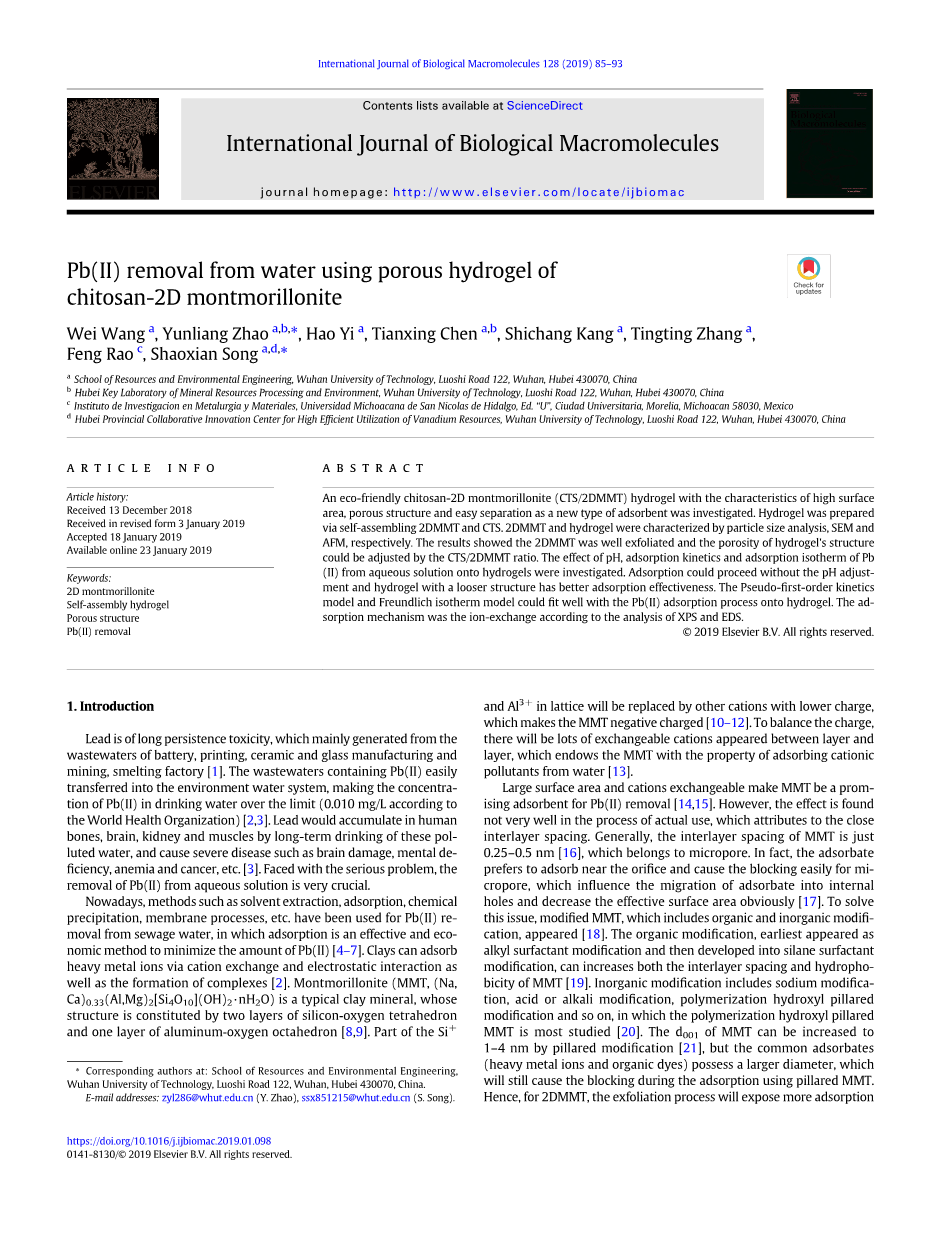 使用多孔水凝胶从水中除去Pb(II)壳聚糖-2D蒙脱石