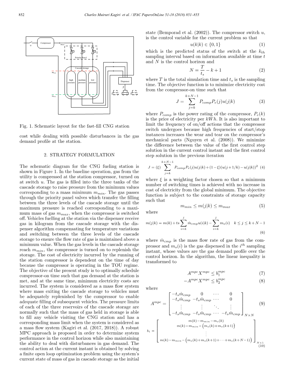 CNG加气站示意图如图1所示。在基线运行时,公用事业的气体在站压缩机处被压缩,在开关u处被打开。这些气体被填充到级联存储的三个储罐中,以提高与质量最小m相对应的最小值的压力min。气体通过优先面板阀,在级联存储的三层之间转移填充,直到达到与最大气体质量m相对应的最大压力max,当压缩机关掉。车辆助长车站通过分发器接收气体的公斤级联存储与分发器算法补偿温度变化和级联的三个层次之间切换存储,确保气体的流量保持在一个最小值。当级联库中气体浓度达到m时min时,打开压缩机补充库存。电站压缩机运行所产生的电力成本取决于一天中的时间,因为压缩机是在TOU制度下运行的。本研究的目的是优化安排压缩机的启动时间,以满足加油站的天然气需求,同时产生最低的电力成本。该系统被认为是一个质量流系统,从级联存储到车辆的质量必须由压缩机充分补充,以使后续车辆得到充分的填充。压力限制的三个水库梯级存储通常这样质量的气体在存储能够填补任何汽车参观CNG站和相应的质量限制系统被认为是一个质量流系统(Kagiri et al .(2017、2018))。提出了一种鲁棒的MPC方法,既能确定系统在控制范围内的性能,又能保持系统对天然气需求干扰的处理能力。通过求解有限开环优化问题,以系统在级联存储中气体质量的当前状态为初始值,得到了当前时刻的控制动作国家(Bemporad等人(2002))。压缩机开关u,是控制变量,用于解决当前的问题