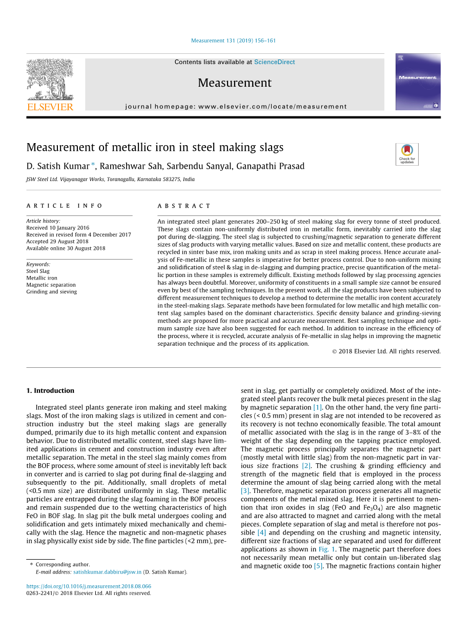 (b)排水:最常用的方法是基于密度测量原理的排水技术,假设金属含量越高,密度就越高[10]。但当铁的氧化物密度增加时,这种方法也不完全可靠。因为炉渣中还含有游离石灰和氧化镁,加入水后会膨胀,增加误差。尽管钢的密度保持恒定,但是基于铁氧化物在炉渣中的变化,炉渣成分的密度在3到3.4g/cc之间变化。在这种方法中,由于细颗粒中漂浮的炉渣颗粒以及精确的水位测量,也会引入误差。由于上述原因,使用水置换技术完成的铁测量必然会有3–6%的误差。这种误差在较高的铁金属含量下是可以接受的,但可能无法真正代表较低的铁金属含量(炉渣)中的值。此外,它还考虑到炉渣中存在的金属小滴,并被报告为可回收金属,并表明金属损失或金属回收过程效率低下或大量金属在倾倒场倾倒。