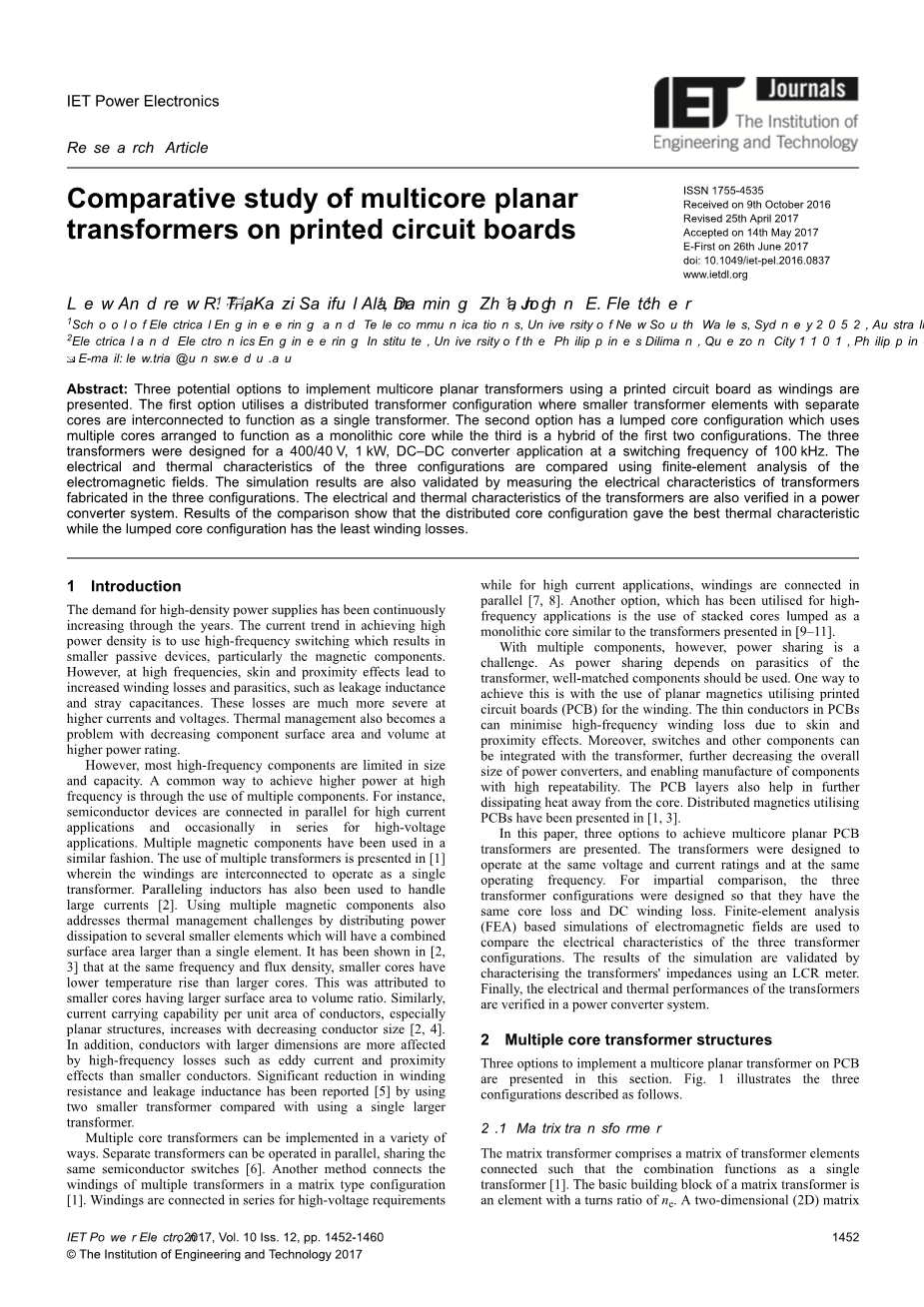 摘要:本文介绍了使用印刷电路板作为绕组实现多核平面变压器的三种潜在选择。第一种选择采用分布式变压器配置,其中具有独立铁芯的较小变压器元件互连以用作单个变压器。第二个选项具有集中式核心配置,它使用多个核心以用作单片核心,第三个核心配置是前两个配置的混合。三个变压器设计用于开关频率为100kHz的400/40V,1kW,DC-DC转换器应用。使用电磁场的有限元分析来比较三种配置的电特性和热特性。通过测量三种不同配置制造的变压器的电气特性,可以验证仿真结果。变压器的电气和热特性也在功率变流器系统中验证。比较结果表明,分布式核心配置具有最佳的热性能,而集中核心配置具有最小的绕组损耗。