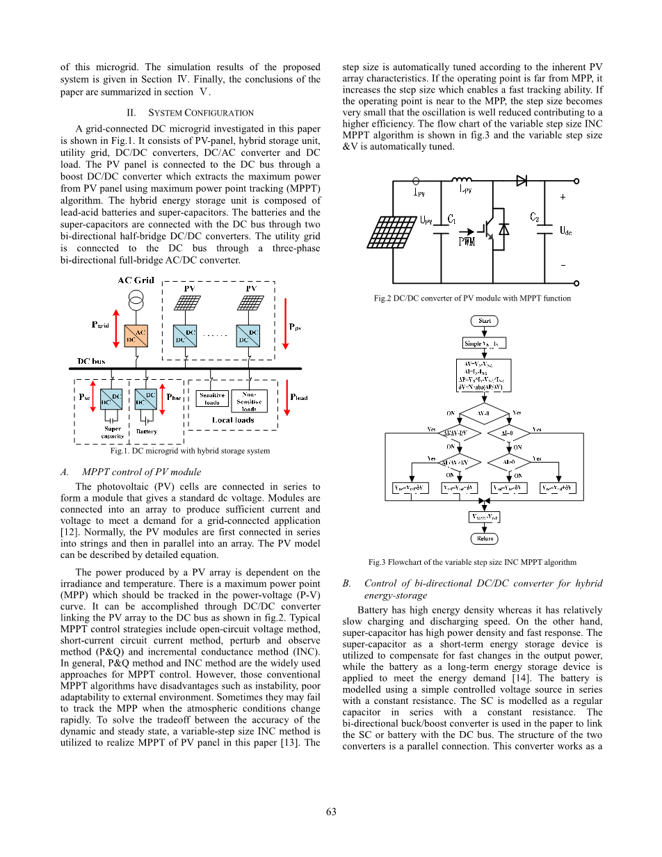 光伏阵列,电池和超级电容器的系统集成已经在一些文献中进行了研究,但是这个系统仍然有一些缺点[9-11]。首先,当它是一个孤岛模式,有时会出现电力短缺。其次,当存储系统充满电时,光伏冗余能源将被浪费。综上所述,我们考虑了基于光伏阵列的混合存储系统与公用电网连接的直流微电网如何工作。本文提出了一种新颖的直流微电网电源管理方案,实现系统稳定,低电压调节,各单元负载均衡。通过MATLAB / SIMULINK仿真平台确定了不同运行方式下的稳态和瞬态转换。