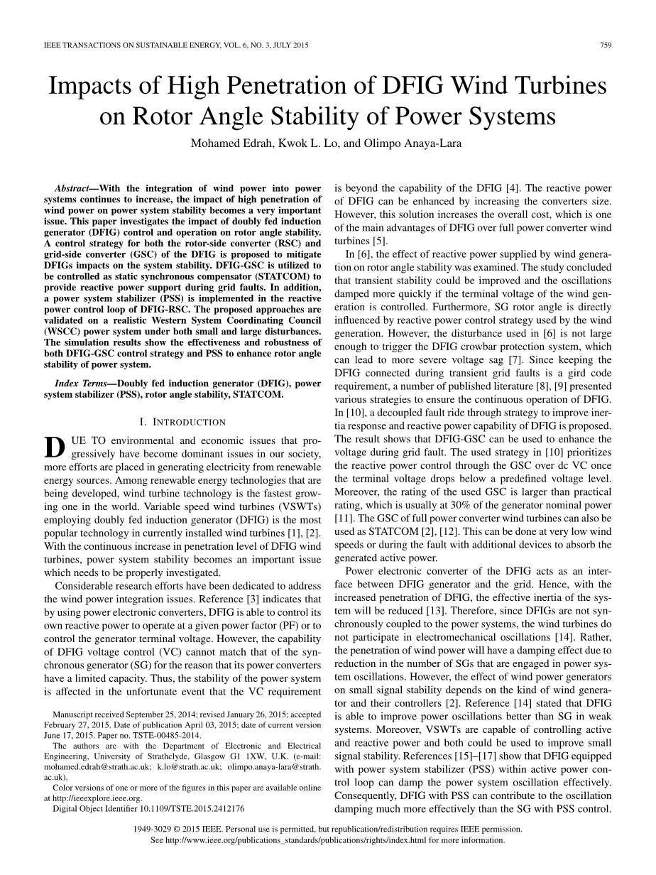 关键词:双馈感应发电机(DFIG),电力系统稳定器(PSS),转子角度稳定性,静态同步补偿器(STATCOM)。
