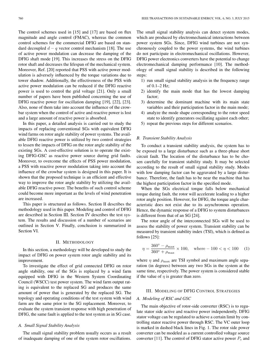 双馈感应发电机的电力电子变流器充当了双馈感应发电机发电机和电网之间的接口。因此,随着双馈感应发电机的渗透率的增加,系统的有效惯性将减小[13]。因此,由于双馈感应发电机不同步耦合到电力系统,风力涡轮机不参与机电振荡[14]。相反,由于参与电力系统振荡的同步发电机数量减少,风电的渗透将产生阻尼效应。然而,风力发电机对小信号稳定性的影响取决于风力发电机及其控制器的类型[2]。参考文献[14]指出双馈感应发电机在弱系统中能够比同步发电机更好地改善功率振荡。而且,变速风力发电机能够控制有功功率和无功功率,并且两者都可用于改善小信号稳定性。参考文献[15] - [17]表明,在有功功率控制回路内配备电力系统稳定器(电力系统稳定器)的双馈感应发电机可以有效抑制电力系统振荡。因此,带有电力系统稳定器的双馈电机比带有电力系统稳定器控制的同步发电机更有效地促成振荡阻尼。