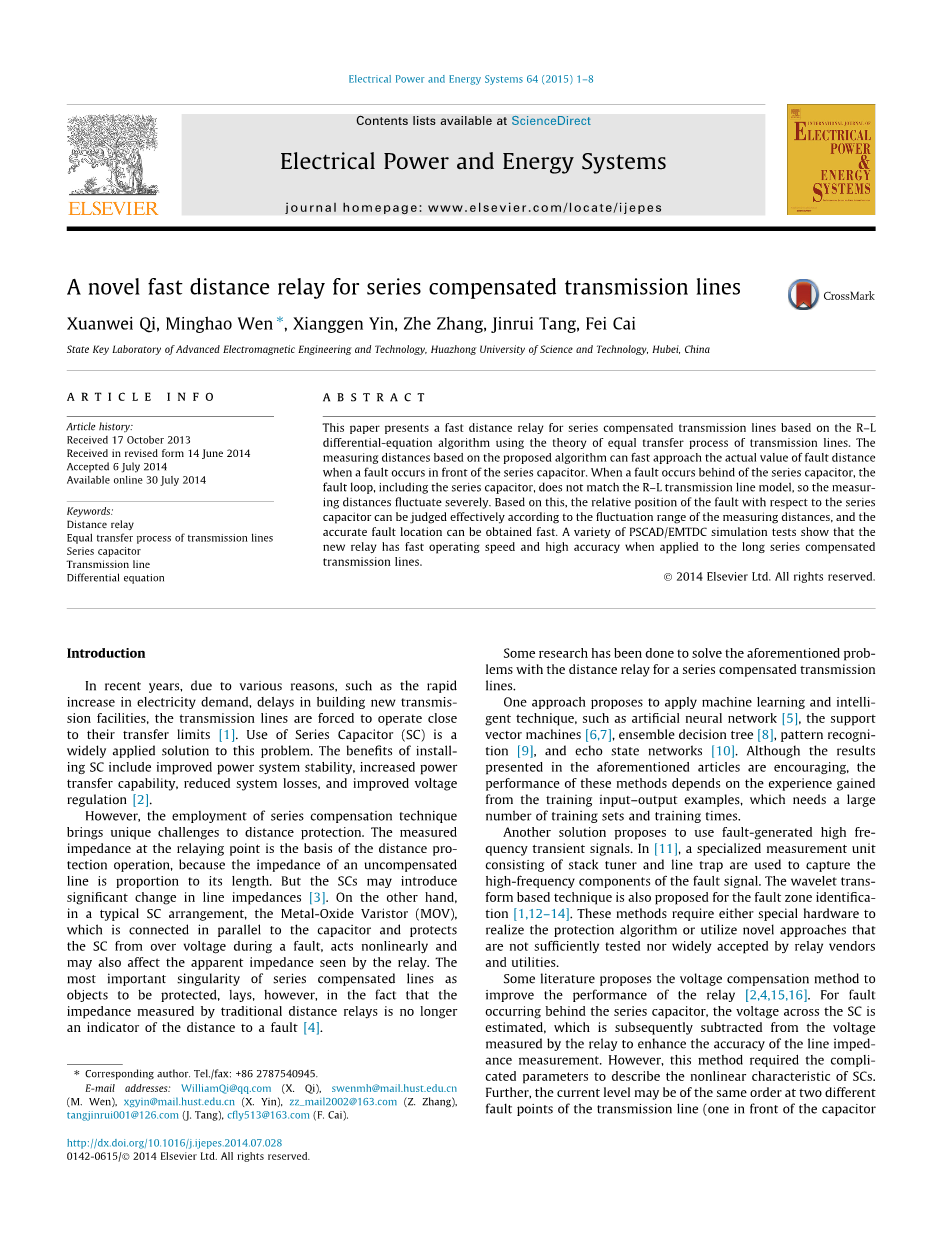本文基于R-L微分方程算法,利用传输线等传递过程理论,提出了一种串联补偿传输线的快速距离继电器。基于该算法的测量距离可以快速逼近串联电容器前端发生故障时故障距离的实际值。当串联电容出现故障时,故障回路(包括串联电容)与R-L传输线模型不匹配,因此测量距离波动严重。基于此,可以根据测量距离的波动范围有效判断故障相对于串联电容器的相对位置,从而可以快速获得准确的故障定位。 2014 Elsevier Ltd.保留所有权利。
