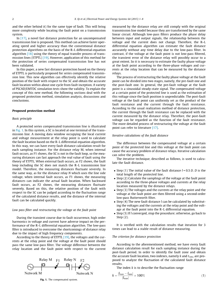 当SC前方发生故障时,如图1的F1所示,继电器N和M的测量距离可快速接近故障距离的实际值,t10%很小。相反,如果故障发生在保护线路后面,如图1中的F2所示。故障回路包括SC,并且与R-L传输线路模型不匹配。因此,测量距离严重波动,t10%较大。因此,如果t10%lt;tset,这意味着故障回路不包括SC,并且可以使用t10%时刻的测量距离来指示实际的故障位置。